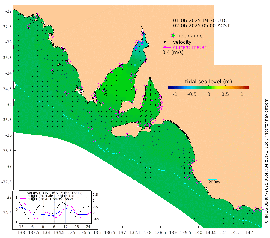 1cm/s 84T +10cm/s rms + 5cm/s 114T. SAM1DS 520m 3cm/s 94T +13cm/s rms + 5cm/s -36T. SAM2CP 100m 6cm/s 107T +21cm/s rms + 18cm/s 142T. SAM3MS 168m 8cm/s 144T +22cm/s rms + 0cm/s -30T. SAM4CY 117m 1cm/s 169T +23cm/s rms + 2cm/s 99T. SAM5CB 94m 5cm/s 96T +8cm/s rms + 3cm/s -172T. SAM6IS 83m 2cm/s 96T +11cm/s rms + 7cm/s 150T. SAM7DS 519m 13cm/s 147T +10cm/s rms + 2cm/s 87T. SAM8SG 47m 5cm/s 169T +20cm/s rms + 12cm/s -168T. NRSKAI 101m -25cm Warrnambool -23cm Port Fairy -23cm Portland -20cm Port Macdonnell -22cm Beachport -22cm Cape Rabelais (off) -20cm Robe -22cm Cape Jaffa -22cm Kingston -22cm Victor Harbor -19cm Vivonne Bay -12cm Kingscote -14cm American River -11cm Penneshaw -13cm Cape Jervis -14cm Second Valley -7cm Port Noarlunga -7cm Port Stanvac -7cm Brighton -5cm Glenelg -5cm Port Adelaide (Outer Harbor) -18cm Angus Inlet (Garden Island) 3cm Ardrossan 3cm Port Vincent 0cm Port Giles -9cm Stenhouse Bay -16cm Althorpe Island -13cm Pondalowie Bay -16cm Point Turton -14cm Port Victoria -21cm Cape Elizabeth -25cm Tiparra Reef Light -38cm Wallaroo -42cm Middle Bank -29cm Port Broughton -83cm Port Pirie -97cm Red Cliff Point (Beacon 5) -78cm Port Bonython -76cm Whyalla -69cm Western Shoal Beacon -28cm Franklin Harbor -25cm Franklin Harbor Entrance Beacon -19cm Arno Bay -18cm Port Neill -17cm Cape Hardy -16cm Tumby Bay -15cm Reevesby Island -13cm Port Lincoln -15cm Taylors Landing -13cm Whalers Bay -16cm Wedge Island Mooring -22cm Shelf Edge Mooring -20cm Coffin Bay Entrance Beacon -19cm Greenly Island -19cm Elliston -16cm Pearson Island -13cm Venus Bay -16cm Blanche Port (Streaky Bay) -16cm Thevenard -14cm St Francis Island
