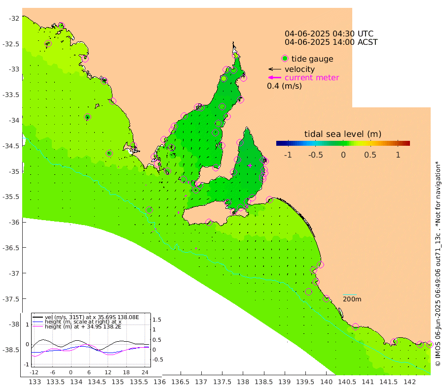 0cm/s -112T +10cm/s rms + 5cm/s 114T. SAM1DS 520m 1cm/s -21T +13cm/s rms + 5cm/s -36T. SAM2CP 100m 3cm/s -1T +21cm/s rms + 18cm/s 142T. SAM3MS 168m 4cm/s 10T +22cm/s rms + 0cm/s -30T. SAM4CY 117m 1cm/s -19T +23cm/s rms + 2cm/s 99T. SAM5CB 94m 6cm/s 48T +8cm/s rms + 3cm/s -172T. SAM6IS 83m 1cm/s -11T +11cm/s rms + 7cm/s 150T. SAM7DS 519m 8cm/s 0T +10cm/s rms + 2cm/s 87T. SAM8SG 47m 6cm/s 4T +20cm/s rms + 12cm/s -168T. NRSKAI 101m 18cm Warrnambool 14cm Port Fairy 14cm Portland 9cm Port Macdonnell 11cm Beachport 12cm Cape Rabelais (off) 12cm Robe 12cm Cape Jaffa 13cm Kingston 13cm Victor Harbor 12cm Vivonne Bay 0cm Kingscote -1cm American River 2cm Penneshaw 2cm Cape Jervis -3cm Second Valley -8cm Port Noarlunga -8cm Port Stanvac -8cm Brighton -9cm Glenelg -12cm Port Adelaide (Outer Harbor) -12cm Angus Inlet (Garden Island) -16cm Ardrossan -21cm Port Vincent -8cm Port Giles 6cm Stenhouse Bay 10cm Althorpe Island 5cm Pondalowie Bay 7cm Point Turton 2cm Port Victoria 2cm Cape Elizabeth 11cm Tiparra Reef Light 10cm Wallaroo 10cm Middle Bank -2cm Port Broughton 13cm Port Pirie 19cm Red Cliff Point (Beacon 5) 9cm Port Bonython 13cm Whyalla 18cm Western Shoal Beacon 3cm Franklin Harbor 11cm Franklin Harbor Entrance Beacon 10cm Arno Bay 13cm Port Neill 13cm Cape Hardy 13cm Tumby Bay 12cm Reevesby Island 11cm Port Lincoln 10cm Taylors Landing 8cm Whalers Bay 9cm Wedge Island Mooring 10cm Shelf Edge Mooring 12cm Coffin Bay Entrance Beacon 10cm Greenly Island 13cm Elliston 7cm Pearson Island 9cm Venus Bay 13cm Blanche Port (Streaky Bay) 14cm Thevenard 16cm St Francis Island