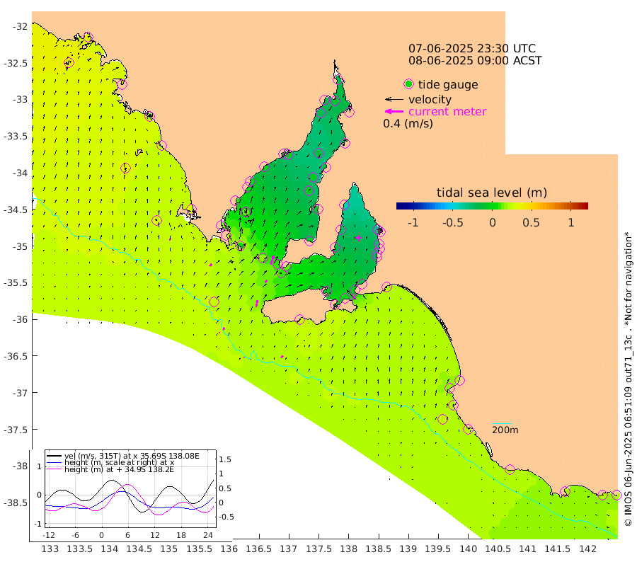 1cm/s 104T +10cm/s rms + 5cm/s 114T. SAM1DS 520m 7cm/s 39T +13cm/s rms + 5cm/s -36T. SAM2CP 100m 5cm/s 19T +21cm/s rms + 18cm/s 142T. SAM3MS 168m 6cm/s 45T +22cm/s rms + 0cm/s -30T. SAM4CY 117m 5cm/s -4T +23cm/s rms + 2cm/s 99T. SAM5CB 94m 6cm/s 41T +8cm/s rms + 3cm/s -172T. SAM6IS 83m 2cm/s 3T +11cm/s rms + 7cm/s 150T. SAM7DS 519m 20cm/s 22T +10cm/s rms + 2cm/s 87T. SAM8SG 47m 15cm/s 12T +20cm/s rms + 12cm/s -168T. NRSKAI 101m 20cm Warrnambool 20cm Port Fairy 21cm Portland 19cm Port Macdonnell 24cm Beachport 23cm Cape Rabelais (off) 21cm Robe 18cm Cape Jaffa 20cm Kingston 22cm Victor Harbor 28cm Vivonne Bay -9cm Kingscote -5cm American River 1cm Penneshaw -5cm Cape Jervis -15cm Second Valley -24cm Port Noarlunga -25cm Port Stanvac -27cm Brighton -29cm Glenelg -32cm Port Adelaide (Outer Harbor) -33cm Angus Inlet (Garden Island) -42cm Ardrossan -25cm Port Vincent -22cm Port Giles 12cm Stenhouse Bay 11cm Althorpe Island 11cm Pondalowie Bay -1cm Point Turton -4cm Port Victoria -5cm Cape Elizabeth -6cm Tiparra Reef Light -13cm Wallaroo -12cm Middle Bank -26cm Port Broughton -16cm Port Pirie -20cm Red Cliff Point (Beacon 5) -10cm Port Bonython -18cm Whyalla -19cm Western Shoal Beacon -17cm Franklin Harbor -4cm Franklin Harbor Entrance Beacon 3cm Arno Bay 6cm Port Neill 5cm Cape Hardy 9cm Tumby Bay 14cm Reevesby Island 18cm Port Lincoln 24cm Taylors Landing 4cm Whalers Bay 17cm Wedge Island Mooring 26cm Shelf Edge Mooring 27cm Coffin Bay Entrance Beacon 27cm Greenly Island 26cm Elliston 30cm Pearson Island 16cm Venus Bay 31cm Blanche Port (Streaky Bay) 33cm Thevenard 35cm St Francis Island
