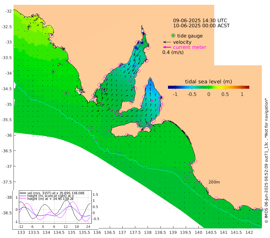 0cm/s -22T +10cm/s rms + 5cm/s 114T. SAM1DS 520m 6cm/s 85T +13cm/s rms + 5cm/s -36T. SAM2CP 100m 8cm/s 122T +21cm/s rms + 18cm/s 142T. SAM3MS 168m 6cm/s 164T +22cm/s rms + 0cm/s -30T. SAM4CY 117m 1cm/s 36T +23cm/s rms + 2cm/s 99T. SAM5CB 94m 9cm/s 76T +8cm/s rms + 3cm/s -172T. SAM6IS 83m 4cm/s 130T +11cm/s rms + 7cm/s 150T. SAM7DS 519m 16cm/s 147T +10cm/s rms + 2cm/s 87T. SAM8SG 47m 5cm/s 164T +20cm/s rms + 12cm/s -168T. NRSKAI 101m -17cm Warrnambool -16cm Port Fairy -15cm Portland -14cm Port Macdonnell -13cm Beachport -12cm Cape Rabelais (off) -10cm Robe -9cm Cape Jaffa -10cm Kingston -14cm Victor Harbor -11cm Vivonne Bay -35cm Kingscote -33cm American River -28cm Penneshaw -34cm Cape Jervis -45cm Second Valley -51cm Port Noarlunga -51cm Port Stanvac -51cm Brighton -52cm Glenelg -59cm Port Adelaide (Outer Harbor) -74cm Angus Inlet (Garden Island) -66cm Ardrossan -43cm Port Vincent -44cm Port Giles -11cm Stenhouse Bay -15cm Althorpe Island -10cm Pondalowie Bay -23cm Point Turton -20cm Port Victoria -27cm Cape Elizabeth -40cm Tiparra Reef Light -53cm Wallaroo -63cm Middle Bank -14cm Port Broughton -94cm Port Pirie -107cm Red Cliff Point (Beacon 5) -100cm Port Bonython -99cm Whyalla -90cm Western Shoal Beacon -49cm Franklin Harbor -45cm Franklin Harbor Entrance Beacon -32cm Arno Bay -28cm Port Neill -23cm Cape Hardy -18cm Tumby Bay -21cm Reevesby Island -12cm Port Lincoln -10cm Taylors Landing -16cm Whalers Bay -14cm Wedge Island Mooring -12cm Shelf Edge Mooring -5cm Coffin Bay Entrance Beacon -5cm Greenly Island 1cm Elliston 1cm Pearson Island 0cm Venus Bay 13cm Blanche Port (Streaky Bay) 12cm Thevenard 11cm St Francis Island