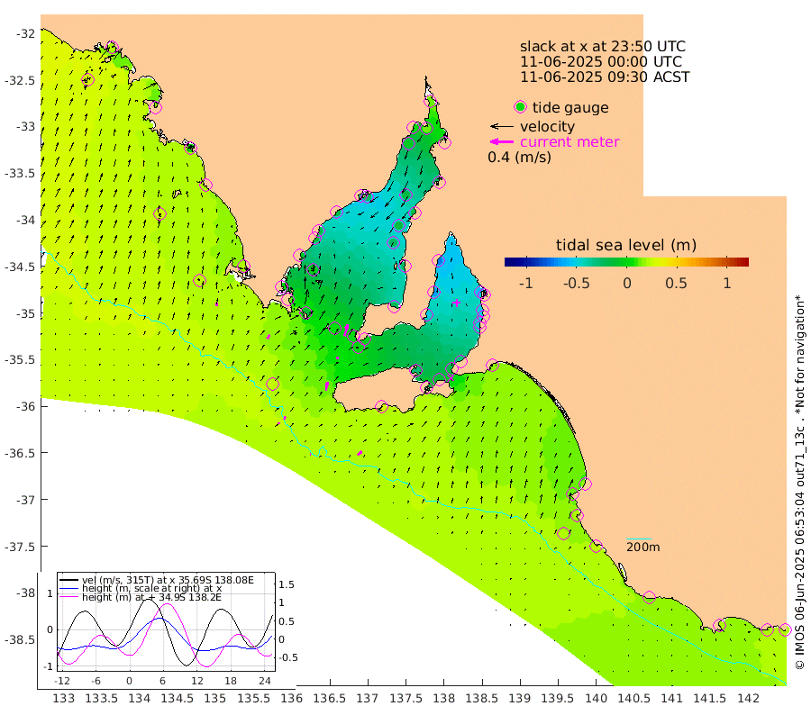1cm/s 92T +10cm/s rms + 5cm/s 114T. SAM1DS 520m 8cm/s 38T +13cm/s rms + 5cm/s -36T. SAM2CP 100m 6cm/s 15T +21cm/s rms + 18cm/s 142T. SAM3MS 168m 9cm/s 45T +22cm/s rms + 0cm/s -30T. SAM4CY 117m 6cm/s 6T +23cm/s rms + 2cm/s 99T. SAM5CB 94m 4cm/s -2T +8cm/s rms + 3cm/s -172T. SAM6IS 83m 3cm/s -9T +11cm/s rms + 7cm/s 150T. SAM7DS 519m 21cm/s 16T +10cm/s rms + 2cm/s 87T. SAM8SG 47m 14cm/s 10T +20cm/s rms + 12cm/s -168T. NRSKAI 101m 21cm Warrnambool 19cm Port Fairy 21cm Portland 15cm Port Macdonnell 23cm Beachport 22cm Cape Rabelais (off) 19cm Robe 14cm Cape Jaffa 16cm Kingston 19cm Victor Harbor 29cm Vivonne Bay -27cm Kingscote -20cm American River -14cm Penneshaw -17cm Cape Jervis -31cm Second Valley -46cm Port Noarlunga -48cm Port Stanvac -50cm Brighton -53cm Glenelg -58cm Port Adelaide (Outer Harbor) -45cm Angus Inlet (Garden Island) -72cm Ardrossan -67cm Port Vincent -50cm Port Giles -1cm Stenhouse Bay 0cm Althorpe Island 1cm Pondalowie Bay -20cm Point Turton -23cm Port Victoria -26cm Cape Elizabeth -18cm Tiparra Reef Light -18cm Wallaroo -17cm Middle Bank -21cm Port Broughton 12cm Port Pirie 15cm Red Cliff Point (Beacon 5) 13cm Port Bonython 2cm Whyalla -4cm Western Shoal Beacon -37cm Franklin Harbor -25cm Franklin Harbor Entrance Beacon -16cm Arno Bay -16cm Port Neill -11cm Cape Hardy -7cm Tumby Bay -4cm Reevesby Island 2cm Port Lincoln 12cm Taylors Landing -12cm Whalers Bay 6cm Wedge Island Mooring 24cm Shelf Edge Mooring 19cm Coffin Bay Entrance Beacon 24cm Greenly Island 20cm Elliston 27cm Pearson Island 7cm Venus Bay 17cm Blanche Port (Streaky Bay) 22cm Thevenard 28cm St Francis Island