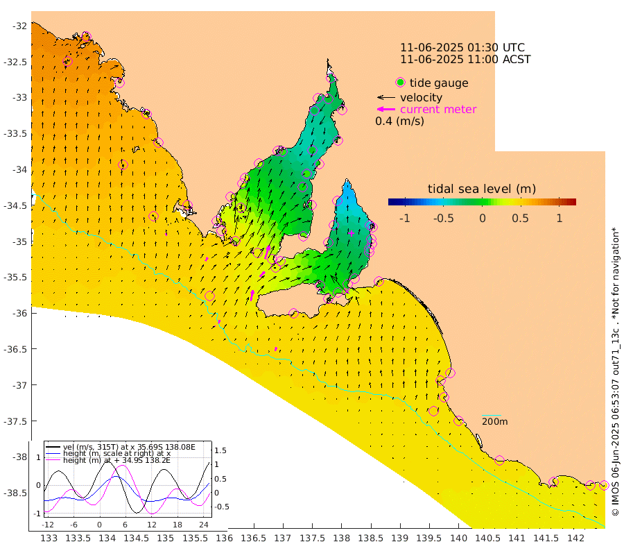 1cm/s 74T +10cm/s rms + 5cm/s 114T. SAM1DS 520m 9cm/s 33T +13cm/s rms + 5cm/s -36T. SAM2CP 100m 8cm/s 14T +21cm/s rms + 18cm/s 142T. SAM3MS 168m 8cm/s 15T +22cm/s rms + 0cm/s -30T. SAM4CY 117m 6cm/s -10T +23cm/s rms + 2cm/s 99T. SAM5CB 94m 16cm/s 43T +8cm/s rms + 3cm/s -172T. SAM6IS 83m 4cm/s 1T +11cm/s rms + 7cm/s 150T. SAM7DS 519m 32cm/s 17T +10cm/s rms + 2cm/s 87T. SAM8SG 47m 25cm/s 11T +20cm/s rms + 12cm/s -168T. NRSKAI 101m 43cm Warrnambool 40cm Port Fairy 43cm Portland 38cm Port Macdonnell 45cm Beachport 46cm Cape Rabelais (off) 44cm Robe 42cm Cape Jaffa 43cm Kingston 46cm Victor Harbor 50cm Vivonne Bay -5cm Kingscote -2cm American River 10cm Penneshaw -1cm Cape Jervis -19cm Second Valley -33cm Port Noarlunga -35cm Port Stanvac -37cm Brighton -39cm Glenelg -48cm Port Adelaide (Outer Harbor) -54cm Angus Inlet (Garden Island) -63cm Ardrossan -39cm Port Vincent -28cm Port Giles 29cm Stenhouse Bay 31cm Althorpe Island 28cm Pondalowie Bay 14cm Point Turton 8cm Port Victoria 5cm Cape Elizabeth 9cm Tiparra Reef Light -3cm Wallaroo -5cm Middle Bank -20cm Port Broughton -16cm Port Pirie -22cm Red Cliff Point (Beacon 5) -11cm Port Bonython -19cm Whyalla -17cm Western Shoal Beacon -17cm Franklin Harbor 10cm Franklin Harbor Entrance Beacon 21cm Arno Bay 30cm Port Neill 30cm Cape Hardy 35cm Tumby Bay 36cm Reevesby Island 43cm Port Lincoln 48cm Taylors Landing 21cm Whalers Bay 38cm Wedge Island Mooring 48cm Shelf Edge Mooring 54cm Coffin Bay Entrance Beacon 50cm Greenly Island 55cm Elliston 57cm Pearson Island 38cm Venus Bay 67cm Blanche Port (Streaky Bay) 69cm Thevenard 67cm St Francis Island