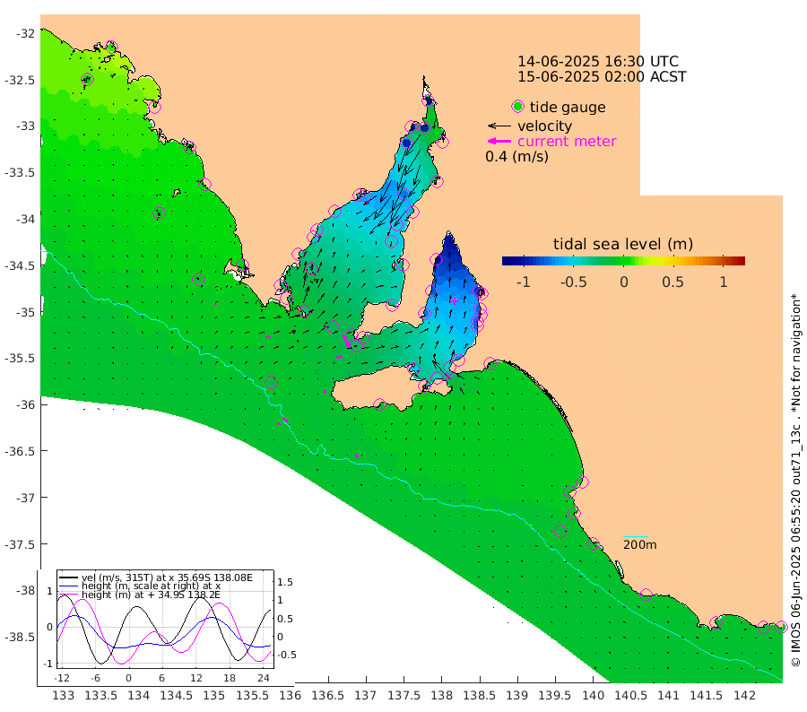0cm/s -50T +10cm/s rms + 5cm/s 114T. SAM1DS 520m 8cm/s 79T +13cm/s rms + 5cm/s -36T. SAM2CP 100m 10cm/s 129T +21cm/s rms + 18cm/s 142T. SAM3MS 168m 8cm/s 158T +22cm/s rms + 0cm/s -30T. SAM4CY 117m 2cm/s 33T +23cm/s rms + 2cm/s 99T. SAM5CB 94m 11cm/s 75T +8cm/s rms + 3cm/s -172T. SAM6IS 83m 5cm/s 128T +11cm/s rms + 7cm/s 150T. SAM7DS 519m 23cm/s 152T +10cm/s rms + 2cm/s 87T. SAM8SG 47m 8cm/s 170T +20cm/s rms + 12cm/s -168T. NRSKAI 101m -13cm Warrnambool -14cm Port Fairy -13cm Portland -14cm Port Macdonnell -13cm Beachport -12cm Cape Rabelais (off) -10cm Robe -11cm Cape Jaffa -9cm Kingston -18cm Victor Harbor -12cm Vivonne Bay -54cm Kingscote -53cm American River -45cm Penneshaw -52cm Cape Jervis -69cm Second Valley -78cm Port Noarlunga -80cm Port Stanvac -82cm Brighton -81cm Glenelg -92cm Port Adelaide (Outer Harbor) -100cm Angus Inlet (Garden Island) -107cm Ardrossan -80cm Port Vincent -73cm Port Giles -19cm Stenhouse Bay -24cm Althorpe Island -15cm Pondalowie Bay -32cm Point Turton -33cm Port Victoria -43cm Cape Elizabeth -49cm Tiparra Reef Light -63cm Wallaroo -74cm Middle Bank -10cm Port Broughton -90cm Port Pirie -108cm Red Cliff Point (Beacon 5) -96cm Port Bonython -102cm Whyalla -97cm Western Shoal Beacon -59cm Franklin Harbor -61cm Franklin Harbor Entrance Beacon -49cm Arno Bay -43cm Port Neill -43cm Cape Hardy -37cm Tumby Bay -32cm Reevesby Island -23cm Port Lincoln -16cm Taylors Landing -28cm Whalers Bay -19cm Wedge Island Mooring -14cm Shelf Edge Mooring -6cm Coffin Bay Entrance Beacon -8cm Greenly Island -4cm Elliston -4cm Pearson Island -3cm Venus Bay 8cm Blanche Port (Streaky Bay) 9cm Thevenard -3cm St Francis Island