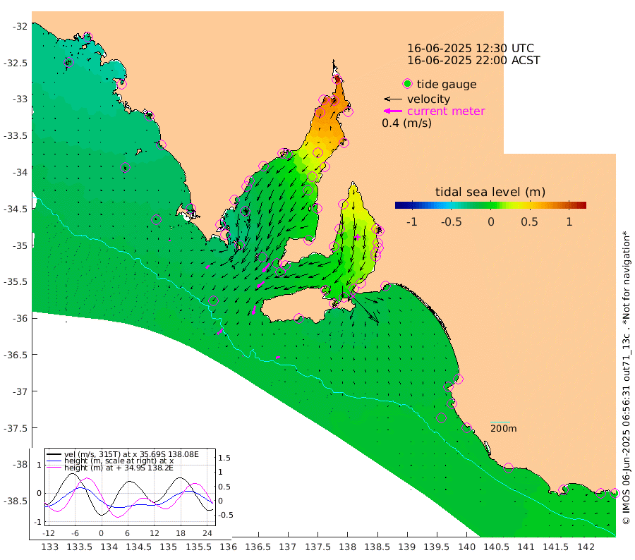 1cm/s -98T +10cm/s rms + 5cm/s 114T. SAM1DS 520m 9cm/s -136T +13cm/s rms + 5cm/s -36T. SAM2CP 100m 10cm/s -142T +21cm/s rms + 18cm/s 142T. SAM3MS 168m 9cm/s -106T +22cm/s rms + 0cm/s -30T. SAM4CY 117m 2cm/s 170T +23cm/s rms + 2cm/s 99T. SAM5CB 94m 19cm/s -128T +8cm/s rms + 3cm/s -172T. SAM6IS 83m 4cm/s -148T +11cm/s rms + 7cm/s 150T. SAM7DS 519m 24cm/s -140T +10cm/s rms + 2cm/s 87T. SAM8SG 47m 19cm/s -165T +20cm/s rms + 12cm/s -168T. NRSKAI 101m -3cm Warrnambool -4cm Port Fairy -5cm Portland -5cm Port Macdonnell -8cm Beachport -7cm Cape Rabelais (off) -7cm Robe -7cm Cape Jaffa -8cm Kingston -11cm Victor Harbor -15cm Vivonne Bay 11cm Kingscote 15cm American River 0cm Penneshaw 10cm Cape Jervis 20cm Second Valley 24cm Port Noarlunga 24cm Port Stanvac 26cm Brighton 24cm Glenelg 30cm Port Adelaide (Outer Harbor) 54cm Angus Inlet (Garden Island) 32cm Ardrossan 18cm Port Vincent 12cm Port Giles -11cm Stenhouse Bay -6cm Althorpe Island -5cm Pondalowie Bay 3cm Point Turton 6cm Port Victoria 11cm Cape Elizabeth 17cm Tiparra Reef Light 40cm Wallaroo 43cm Middle Bank 63cm Port Broughton 107cm Port Pirie 113cm Red Cliff Point (Beacon 5) 100cm Port Bonython 95cm Whyalla 81cm Western Shoal Beacon 30cm Franklin Harbor 3cm Franklin Harbor Entrance Beacon -6cm Arno Bay -13cm Port Neill -13cm Cape Hardy -18cm Tumby Bay -16cm Reevesby Island -23cm Port Lincoln -22cm Taylors Landing -5cm Whalers Bay -12cm Wedge Island Mooring -11cm Shelf Edge Mooring -19cm Coffin Bay Entrance Beacon -16cm Greenly Island -21cm Elliston -17cm Pearson Island -13cm Venus Bay -31cm Blanche Port (Streaky Bay) -33cm Thevenard -22cm St Francis Island