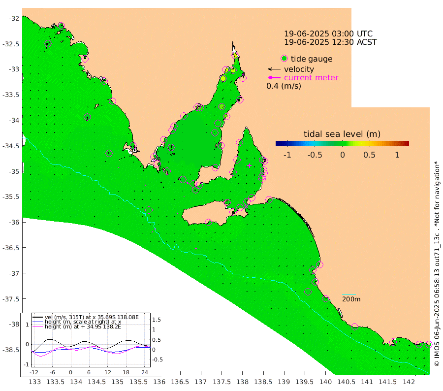 1cm/s 156T +10cm/s rms + 5cm/s 114T. SAM1DS 520m 2cm/s -80T +13cm/s rms + 5cm/s -36T. SAM2CP 100m 3cm/s -18T +21cm/s rms + 18cm/s 142T. SAM3MS 168m 4cm/s 36T +22cm/s rms + 0cm/s -30T. SAM4CY 117m 0cm/s 173T +23cm/s rms + 2cm/s 99T. SAM5CB 94m 1cm/s -50T +8cm/s rms + 3cm/s -172T. SAM6IS 83m 2cm/s -35T +11cm/s rms + 7cm/s 150T. SAM7DS 519m 5cm/s -30T +10cm/s rms + 2cm/s 87T. SAM8SG 47m 2cm/s -18T +20cm/s rms + 12cm/s -168T. NRSKAI 101m 5cm Warrnambool 4cm Port Fairy 4cm Portland -2cm Port Macdonnell 2cm Beachport 1cm Cape Rabelais (off) 1cm Robe 1cm Cape Jaffa 1cm Kingston 3cm Victor Harbor 3cm Vivonne Bay 4cm Kingscote 3cm American River 0cm Penneshaw 4cm Cape Jervis 4cm Second Valley 4cm Port Noarlunga 4cm Port Stanvac 4cm Brighton 1cm Glenelg 4cm Port Adelaide (Outer Harbor) 7cm Angus Inlet (Garden Island) 2cm Ardrossan 0cm Port Vincent 0cm Port Giles -3cm Stenhouse Bay 1cm Althorpe Island -3cm Pondalowie Bay 1cm Point Turton -3cm Port Victoria 2cm Cape Elizabeth 7cm Tiparra Reef Light 11cm Wallaroo 14cm Middle Bank -5cm Port Broughton 28cm Port Pirie 39cm Red Cliff Point (Beacon 5) 24cm Port Bonython 27cm Whyalla 29cm Western Shoal Beacon 11cm Franklin Harbor 9cm Franklin Harbor Entrance Beacon 3cm Arno Bay 2cm Port Neill 3cm Cape Hardy 2cm Tumby Bay 5cm Reevesby Island 0cm Port Lincoln 0cm Taylors Landing 0cm Whalers Bay 0cm Wedge Island Mooring 1cm Shelf Edge Mooring 1cm Coffin Bay Entrance Beacon 0cm Greenly Island -1cm Elliston -5cm Pearson Island 0cm Venus Bay -2cm Blanche Port (Streaky Bay) -2cm Thevenard 2cm St Francis Island