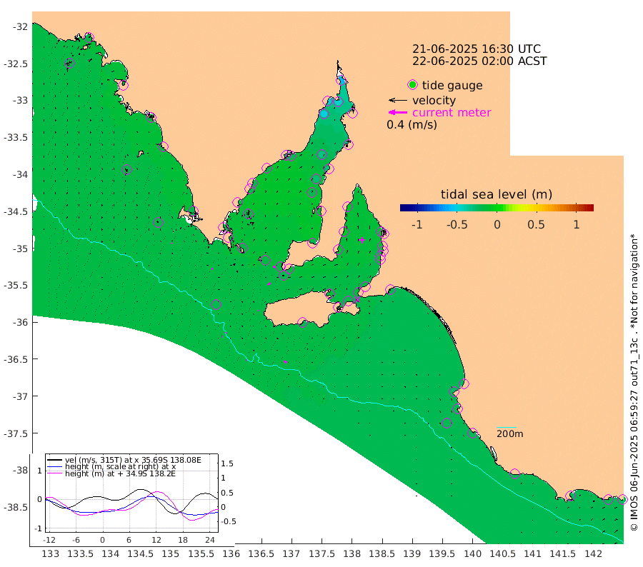 1cm/s 80T +10cm/s rms + 5cm/s 114T. SAM1DS 520m 2cm/s 97T +13cm/s rms + 5cm/s -36T. SAM2CP 100m 3cm/s 79T +21cm/s rms + 18cm/s 142T. SAM3MS 168m 6cm/s 113T +22cm/s rms + 0cm/s -30T. SAM4CY 117m 2cm/s 153T +23cm/s rms + 2cm/s 99T. SAM5CB 94m 7cm/s 50T +8cm/s rms + 3cm/s -172T. SAM6IS 83m 1cm/s 77T +11cm/s rms + 7cm/s 150T. SAM7DS 519m 5cm/s 109T +10cm/s rms + 2cm/s 87T. SAM8SG 47m 2cm/s 169T +20cm/s rms + 12cm/s -168T. NRSKAI 101m -24cm Warrnambool -22cm Port Fairy -23cm Portland -25cm Port Macdonnell -21cm Beachport -21cm Cape Rabelais (off) -22cm Robe -23cm Cape Jaffa -23cm Kingston -22cm Victor Harbor -19cm Vivonne Bay -13cm Kingscote -18cm American River -16cm Penneshaw -14cm Cape Jervis -17cm Second Valley -10cm Port Noarlunga -10cm Port Stanvac -9cm Brighton -8cm Glenelg -8cm Port Adelaide (Outer Harbor) -11cm Angus Inlet (Garden Island) -4cm Ardrossan -7cm Port Vincent -9cm Port Giles -17cm Stenhouse Bay -22cm Althorpe Island -17cm Pondalowie Bay -21cm Point Turton -15cm Port Victoria -20cm Cape Elizabeth -28cm Tiparra Reef Light -33cm Wallaroo -33cm Middle Bank -35cm Port Broughton -56cm Port Pirie -57cm Red Cliff Point (Beacon 5) -47cm Port Bonython -50cm Whyalla -49cm Western Shoal Beacon -27cm Franklin Harbor -22cm Franklin Harbor Entrance Beacon -19cm Arno Bay -20cm Port Neill -19cm Cape Hardy -18cm Tumby Bay -18cm Reevesby Island -17cm Port Lincoln -17cm Taylors Landing -18cm Whalers Bay -19cm Wedge Island Mooring -20cm Shelf Edge Mooring -20cm Coffin Bay Entrance Beacon -15cm Greenly Island -19cm Elliston -16cm Pearson Island -18cm Venus Bay -20cm Blanche Port (Streaky Bay) -17cm Thevenard -19cm St Francis Island