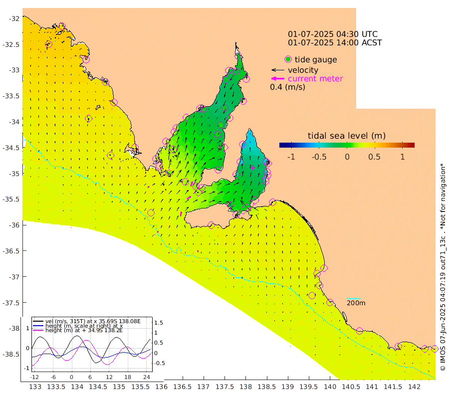 1cm/s -53T +10cm/s rms + 5cm/s 114T. SAM1DS 520m 5cm/s 43T +13cm/s rms + 5cm/s -36T. SAM2CP 100m 4cm/s 19T +21cm/s rms + 18cm/s 142T. SAM3MS 168m 6cm/s -8T +22cm/s rms + 0cm/s -30T. SAM4CY 117m 3cm/s -2T +23cm/s rms + 2cm/s 99T. SAM5CB 94m 15cm/s 54T +8cm/s rms + 3cm/s -172T. SAM6IS 83m 2cm/s 2T +11cm/s rms + 7cm/s 150T. SAM7DS 519m 15cm/s 23T +10cm/s rms + 2cm/s 87T. SAM8SG 47m 14cm/s 11T +20cm/s rms + 12cm/s -168T. NRSKAI 101m 35cm Warrnambool 32cm Port Fairy 32cm Portland 27cm Port Macdonnell 29cm Beachport 32cm Cape Rabelais (off) 30cm Robe 31cm Cape Jaffa 33cm Kingston 31cm Victor Harbor 31cm Vivonne Bay -12cm Kingscote -12cm American River 0cm Penneshaw -8cm Cape Jervis -22cm Second Valley -37cm Port Noarlunga -39cm Port Stanvac -41cm Brighton -42cm Glenelg -51cm Port Adelaide (Outer Harbor) -58cm Angus Inlet (Garden Island) -65cm Ardrossan -50cm Port Vincent -34cm Port Giles 16cm Stenhouse Bay 21cm Althorpe Island 15cm Pondalowie Bay 7cm Point Turton 1cm Port Victoria 0cm Cape Elizabeth 5cm Tiparra Reef Light -3cm Wallaroo -6cm Middle Bank -3cm Port Broughton -10cm Port Pirie -8cm Red Cliff Point (Beacon 5) -17cm Port Bonython -16cm Whyalla -11cm Western Shoal Beacon -11cm Franklin Harbor 4cm Franklin Harbor Entrance Beacon 8cm Arno Bay 18cm Port Neill 18cm Cape Hardy 22cm Tumby Bay 19cm Reevesby Island 25cm Port Lincoln 28cm Taylors Landing 12cm Whalers Bay 22cm Wedge Island Mooring 28cm Shelf Edge Mooring 34cm Coffin Bay Entrance Beacon 30cm Greenly Island 36cm Elliston 32cm Pearson Island 26cm Venus Bay 45cm Blanche Port (Streaky Bay) 45cm Thevenard 48cm St Francis Island