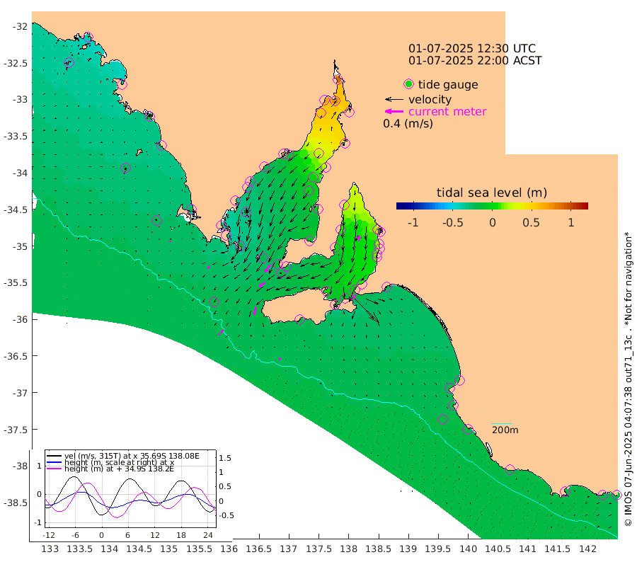 1cm/s -97T +10cm/s rms + 5cm/s 114T. SAM1DS 520m 6cm/s -135T +13cm/s rms + 5cm/s -36T. SAM2CP 100m 8cm/s -142T +21cm/s rms + 18cm/s 142T. SAM3MS 168m 5cm/s -120T +22cm/s rms + 0cm/s -30T. SAM4CY 117m 2cm/s 154T +23cm/s rms + 2cm/s 99T. SAM5CB 94m 15cm/s -124T +8cm/s rms + 3cm/s -172T. SAM6IS 83m 3cm/s -152T +11cm/s rms + 7cm/s 150T. SAM7DS 519m 21cm/s -145T +10cm/s rms + 2cm/s 87T. SAM8SG 47m 17cm/s -166T +20cm/s rms + 12cm/s -168T. NRSKAI 101m -17cm Warrnambool -17cm Port Fairy -18cm Portland -17cm Port Macdonnell -17cm Beachport -17cm Cape Rabelais (off) -18cm Robe -18cm Cape Jaffa -19cm Kingston -20cm Victor Harbor -22cm Vivonne Bay 2cm Kingscote 4cm American River -11cm Penneshaw 0cm Cape Jervis 10cm Second Valley 14cm Port Noarlunga 15cm Port Stanvac 17cm Brighton 16cm Glenelg 21cm Port Adelaide (Outer Harbor) 44cm Angus Inlet (Garden Island) 22cm Ardrossan 10cm Port Vincent 3cm Port Giles -20cm Stenhouse Bay -19cm Althorpe Island -14cm Pondalowie Bay -10cm Point Turton -7cm Port Victoria -2cm Cape Elizabeth -2cm Tiparra Reef Light 20cm Wallaroo 23cm Middle Bank 41cm Port Broughton 80cm Port Pirie 88cm Red Cliff Point (Beacon 5) 77cm Port Bonython 69cm Whyalla 56cm Western Shoal Beacon 16cm Franklin Harbor -9cm Franklin Harbor Entrance Beacon -18cm Arno Bay -26cm Port Neill -26cm Cape Hardy -29cm Tumby Bay -27cm Reevesby Island -32cm Port Lincoln -28cm Taylors Landing -17cm Whalers Bay -21cm Wedge Island Mooring -18cm Shelf Edge Mooring -26cm Coffin Bay Entrance Beacon -22cm Greenly Island -28cm Elliston -25cm Pearson Island -21cm Venus Bay -40cm Blanche Port (Streaky Bay) -40cm Thevenard -43cm St Francis Island