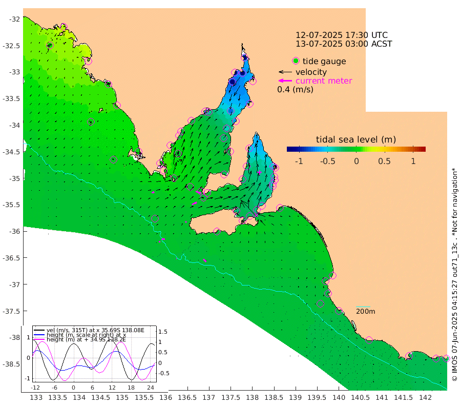1cm/s 92T +10cm/s rms + 5cm/s 114T. SAM1DS 520m 8cm/s 70T +13cm/s rms + 5cm/s -36T. SAM2CP 100m 9cm/s 96T +21cm/s rms + 18cm/s 142T. SAM3MS 168m 11cm/s 132T +22cm/s rms + 0cm/s -30T. SAM4CY 117m 0cm/s 166T +23cm/s rms + 2cm/s 99T. SAM5CB 94m 16cm/s 64T +8cm/s rms + 3cm/s -172T. SAM6IS 83m 5cm/s 96T +11cm/s rms + 7cm/s 150T. SAM7DS 519m 17cm/s 108T +10cm/s rms + 2cm/s 87T. SAM8SG 47m 4cm/s 64T +20cm/s rms + 12cm/s -168T. NRSKAI 101m -24cm Warrnambool -21cm Port Fairy -21cm Portland -17cm Port Macdonnell -18cm Beachport -18cm Cape Rabelais (off) -16cm Robe -16cm Cape Jaffa -13cm Kingston -17cm Victor Harbor -12cm Vivonne Bay -31cm Kingscote -34cm American River -23cm Penneshaw -32cm Cape Jervis -44cm Second Valley -42cm Port Noarlunga -43cm Port Stanvac -45cm Brighton -41cm Glenelg -48cm Port Adelaide (Outer Harbor) -74cm Angus Inlet (Garden Island) -49cm Ardrossan -23cm Port Vincent -29cm Port Giles -6cm Stenhouse Bay -15cm Althorpe Island -9cm Pondalowie Bay -19cm Point Turton -17cm Port Victoria -28cm Cape Elizabeth -41cm Tiparra Reef Light -68cm Wallaroo -78cm Middle Bank -55cm Port Broughton -152cm Port Pirie -170cm Red Cliff Point (Beacon 5) -143cm Port Bonython -144cm Whyalla -129cm Western Shoal Beacon -52cm Franklin Harbor -36cm Franklin Harbor Entrance Beacon -21cm Arno Bay -13cm Port Neill -15cm Cape Hardy -10cm Tumby Bay -8cm Reevesby Island -1cm Port Lincoln -3cm Taylors Landing -13cm Whalers Bay -10cm Wedge Island Mooring -14cm Shelf Edge Mooring -2cm Coffin Bay Entrance Beacon -6cm Greenly Island 0cm Elliston 1cm Pearson Island 1cm Venus Bay 19cm Blanche Port (Streaky Bay) 20cm Thevenard 7cm St Francis Island