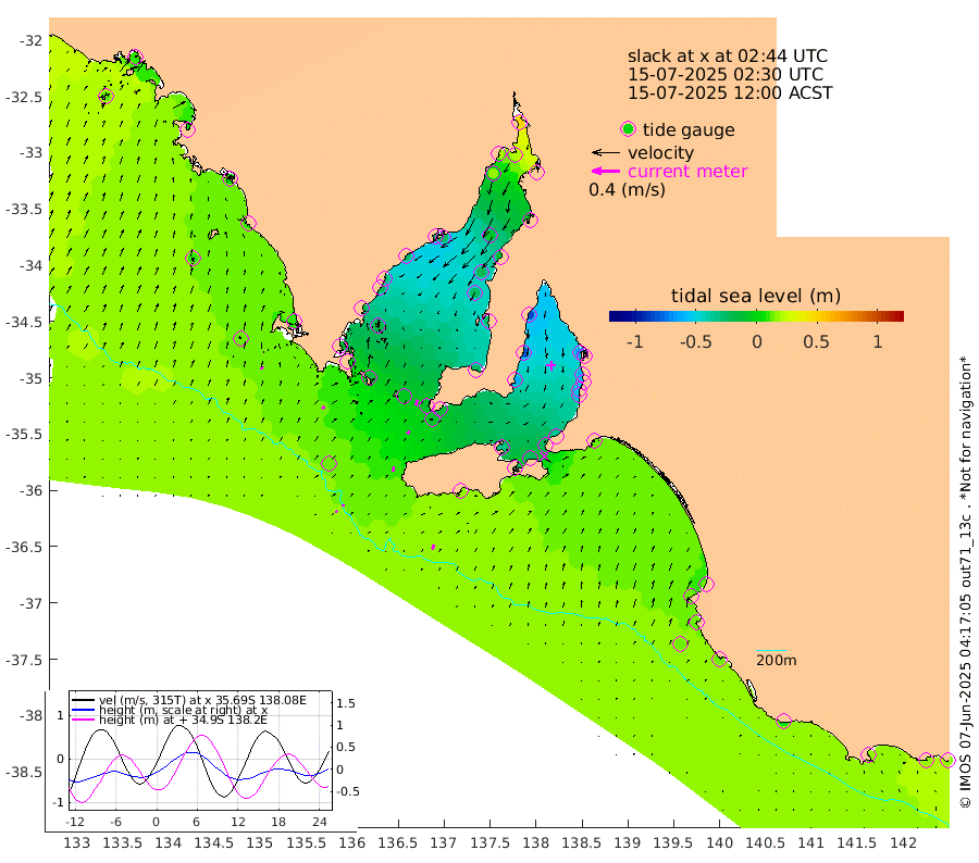 0cm/s -74T +10cm/s rms + 5cm/s 114T. SAM1DS 520m 5cm/s 40T +13cm/s rms + 5cm/s -36T. SAM2CP 100m 3cm/s -6T +21cm/s rms + 18cm/s 142T. SAM3MS 168m 7cm/s 26T +22cm/s rms + 0cm/s -30T. SAM4CY 117m 5cm/s 20T +23cm/s rms + 2cm/s 99T. SAM5CB 94m 5cm/s 34T +8cm/s rms + 3cm/s -172T. SAM6IS 83m 2cm/s -43T +11cm/s rms + 7cm/s 150T. SAM7DS 519m 9cm/s 13T +10cm/s rms + 2cm/s 87T. SAM8SG 47m 6cm/s 2T +20cm/s rms + 12cm/s -168T. NRSKAI 101m 18cm Warrnambool 16cm Port Fairy 16cm Portland 7cm Port Macdonnell 15cm Beachport 14cm Cape Rabelais (off) 13cm Robe 12cm Cape Jaffa 11cm Kingston 11cm Victor Harbor 17cm Vivonne Bay -30cm Kingscote -27cm American River -23cm Penneshaw -23cm Cape Jervis -34cm Second Valley -53cm Port Noarlunga -56cm Port Stanvac -56cm Brighton -61cm Glenelg -65cm Port Adelaide (Outer Harbor) -53cm Angus Inlet (Garden Island) -84cm Ardrossan -79cm Port Vincent -61cm Port Giles -12cm Stenhouse Bay -8cm Althorpe Island -9cm Pondalowie Bay -25cm Point Turton -29cm Port Victoria -26cm Cape Elizabeth -20cm Tiparra Reef Light -12cm Wallaroo -11cm Middle Bank -2cm Port Broughton 40cm Port Pirie 51cm Red Cliff Point (Beacon 5) 22cm Port Bonython 22cm Whyalla 18cm Western Shoal Beacon -23cm Franklin Harbor -26cm Franklin Harbor Entrance Beacon -28cm Arno Bay -32cm Port Neill -22cm Cape Hardy -18cm Tumby Bay -15cm Reevesby Island -13cm Port Lincoln -1cm Taylors Landing -18cm Whalers Bay -4cm Wedge Island Mooring 13cm Shelf Edge Mooring 9cm Coffin Bay Entrance Beacon 13cm Greenly Island 11cm Elliston 8cm Pearson Island 0cm Venus Bay 5cm Blanche Port (Streaky Bay) 8cm Thevenard 13cm St Francis Island