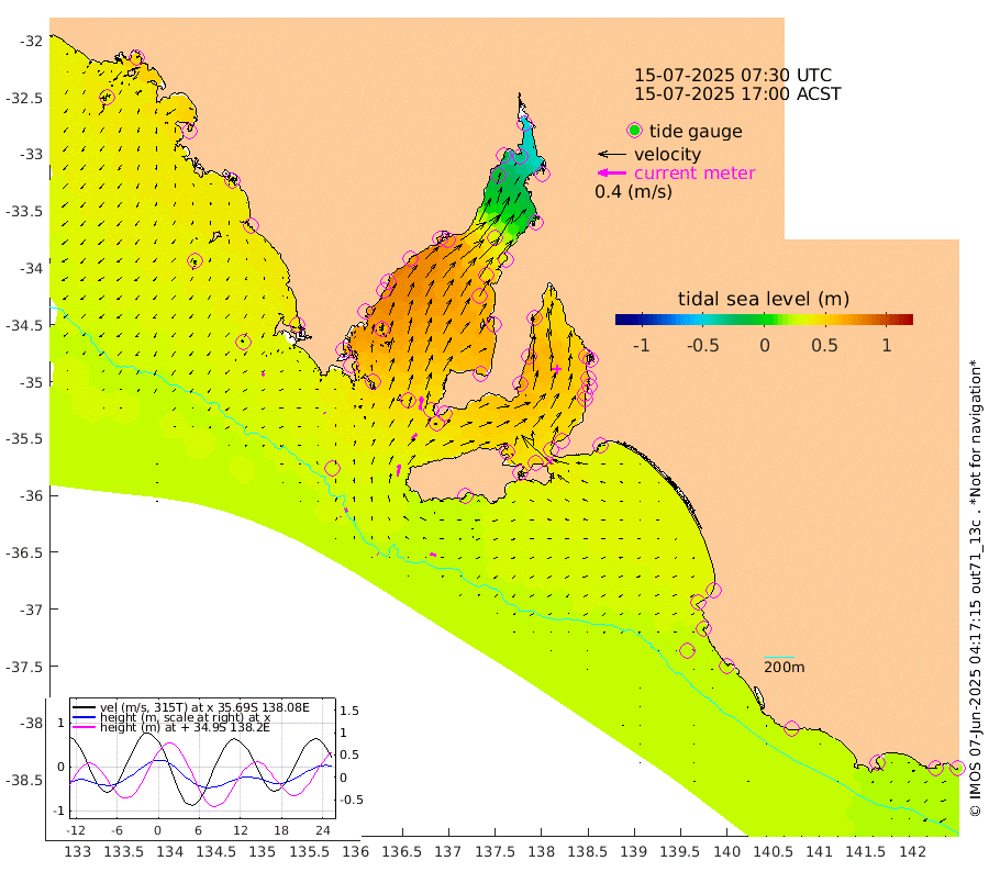1cm/s -53T +10cm/s rms + 5cm/s 114T. SAM1DS 520m 2cm/s -72T +13cm/s rms + 5cm/s -36T. SAM2CP 100m 5cm/s -18T +21cm/s rms + 18cm/s 142T. SAM3MS 168m 8cm/s -73T +22cm/s rms + 0cm/s -30T. SAM4CY 117m 3cm/s -134T +23cm/s rms + 2cm/s 99T. SAM5CB 94m 9cm/s 49T +8cm/s rms + 3cm/s -172T. SAM6IS 83m 2cm/s -3T +11cm/s rms + 7cm/s 150T. SAM7DS 519m 19cm/s 8T +10cm/s rms + 2cm/s 87T. SAM8SG 47m 16cm/s 10T +20cm/s rms + 12cm/s -168T. NRSKAI 101m 22cm Warrnambool 23cm Port Fairy 23cm Portland 32cm Port Macdonnell 24cm Beachport 26cm Cape Rabelais (off) 26cm Robe 33cm Cape Jaffa 31cm Kingston 33cm Victor Harbor 23cm Vivonne Bay 49cm Kingscote 42cm American River 50cm Penneshaw 41cm Cape Jervis 48cm Second Valley 54cm Port Noarlunga 56cm Port Stanvac 56cm Brighton 60cm Glenelg 58cm Port Adelaide (Outer Harbor) 30cm Angus Inlet (Garden Island) 69cm Ardrossan 76cm Port Vincent 68cm Port Giles 46cm Stenhouse Bay 46cm Althorpe Island 39cm Pondalowie Bay 57cm Point Turton 57cm Port Victoria 58cm Cape Elizabeth 48cm Tiparra Reef Light 32cm Wallaroo 33cm Middle Bank -1cm Port Broughton -41cm Port Pirie -47cm Red Cliff Point (Beacon 5) -31cm Port Bonython -19cm Whyalla -8cm Western Shoal Beacon 45cm Franklin Harbor 69cm Franklin Harbor Entrance Beacon 70cm Arno Bay 79cm Port Neill 71cm Cape Hardy 71cm Tumby Bay 58cm Reevesby Island 61cm Port Lincoln 49cm Taylors Landing 54cm Whalers Bay 46cm Wedge Island Mooring 28cm Shelf Edge Mooring 38cm Coffin Bay Entrance Beacon 28cm Greenly Island 40cm Elliston 34cm Pearson Island 36cm Venus Bay 54cm Blanche Port (Streaky Bay) 50cm Thevenard 36cm St Francis Island