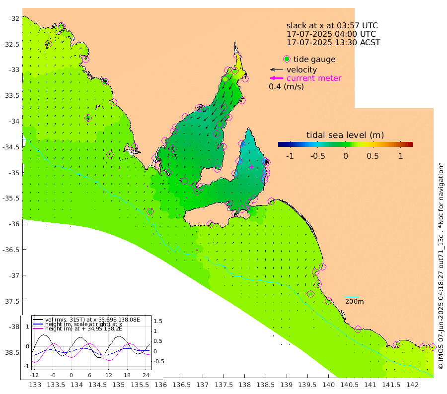 1cm/s -84T +10cm/s rms + 5cm/s 114T. SAM1DS 520m 2cm/s 51T +13cm/s rms + 5cm/s -36T. SAM2CP 100m 1cm/s -50T +21cm/s rms + 18cm/s 142T. SAM3MS 168m 4cm/s -14T +22cm/s rms + 0cm/s -30T. SAM4CY 117m 3cm/s 27T +23cm/s rms + 2cm/s 99T. SAM5CB 94m 3cm/s 66T +8cm/s rms + 3cm/s -172T. SAM6IS 83m 1cm/s -86T +11cm/s rms + 7cm/s 150T. SAM7DS 519m 1cm/s 0T +10cm/s rms + 2cm/s 87T. SAM8SG 47m 1cm/s -16T +20cm/s rms + 12cm/s -168T. NRSKAI 101m 21cm Warrnambool 19cm Port Fairy 18cm Portland 12cm Port Macdonnell 14cm Beachport 15cm Cape Rabelais (off) 14cm Robe 16cm Cape Jaffa 16cm Kingston 13cm Victor Harbor 13cm Vivonne Bay -24cm Kingscote -21cm American River -17cm Penneshaw -18cm Cape Jervis -28cm Second Valley -44cm Port Noarlunga -47cm Port Stanvac -48cm Brighton -51cm Glenelg -56cm Port Adelaide (Outer Harbor) -51cm Angus Inlet (Garden Island) -72cm Ardrossan -63cm Port Vincent -49cm Port Giles -6cm Stenhouse Bay -1cm Althorpe Island -2cm Pondalowie Bay -10cm Point Turton -15cm Port Victoria -12cm Cape Elizabeth -7cm Tiparra Reef Light -2cm Wallaroo -4cm Middle Bank 13cm Port Broughton 31cm Port Pirie 39cm Red Cliff Point (Beacon 5) 14cm Port Bonython 16cm Whyalla 16cm Western Shoal Beacon -9cm Franklin Harbor -14cm Franklin Harbor Entrance Beacon -16cm Arno Bay -16cm Port Neill -10cm Cape Hardy -8cm Tumby Bay -6cm Reevesby Island -5cm Port Lincoln 2cm Taylors Landing -8cm Whalers Bay 1cm Wedge Island Mooring 11cm Shelf Edge Mooring 12cm Coffin Bay Entrance Beacon 11cm Greenly Island 12cm Elliston 8cm Pearson Island 7cm Venus Bay 13cm Blanche Port (Streaky Bay) 14cm Thevenard 17cm St Francis Island