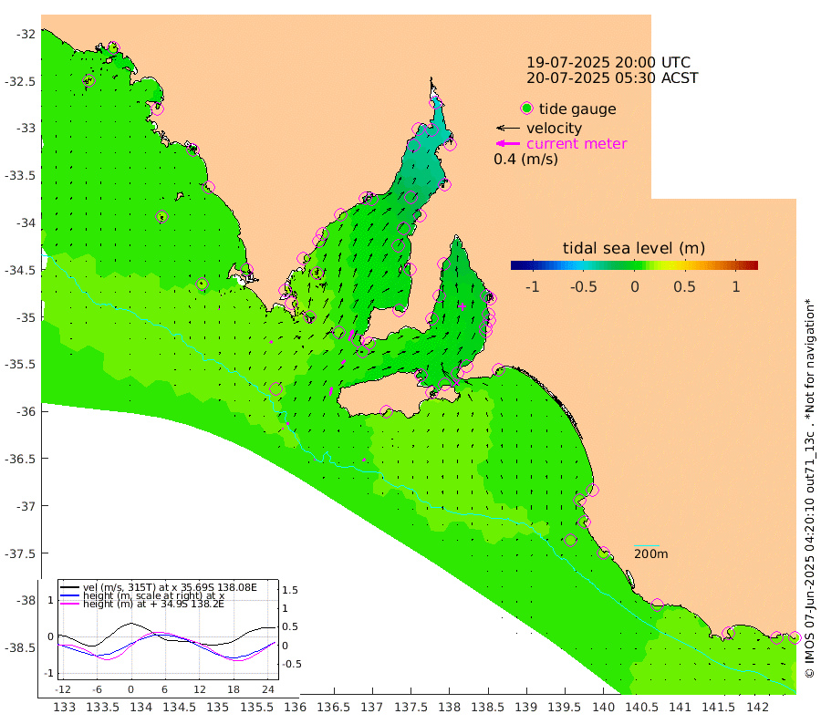 1cm/s 59T +10cm/s rms + 5cm/s 114T. SAM1DS 520m 5cm/s 44T +13cm/s rms + 5cm/s -36T. SAM2CP 100m 5cm/s 9T +21cm/s rms + 18cm/s 142T. SAM3MS 168m 6cm/s 56T +22cm/s rms + 0cm/s -30T. SAM4CY 117m 2cm/s -10T +23cm/s rms + 2cm/s 99T. SAM5CB 94m 8cm/s 40T +8cm/s rms + 3cm/s -172T. SAM6IS 83m 3cm/s 7T +11cm/s rms + 7cm/s 150T. SAM7DS 519m 19cm/s 23T +10cm/s rms + 2cm/s 87T. SAM8SG 47m 14cm/s 13T +20cm/s rms + 12cm/s -168T. NRSKAI 101m 15cm Warrnambool 15cm Port Fairy 15cm Portland 15cm Port Macdonnell 15cm Beachport 14cm Cape Rabelais (off) 14cm Robe 12cm Cape Jaffa 12cm Kingston 14cm Victor Harbor 17cm Vivonne Bay -1cm Kingscote -1cm American River 10cm Penneshaw 2cm Cape Jervis -4cm Second Valley -5cm Port Noarlunga -5cm Port Stanvac -8cm Brighton -6cm Glenelg -8cm Port Adelaide (Outer Harbor) -15cm Angus Inlet (Garden Island) -7cm Ardrossan -9cm Port Vincent 1cm Port Giles 13cm Stenhouse Bay 8cm Althorpe Island 9cm Pondalowie Bay 5cm Point Turton 7cm Port Victoria 1cm Cape Elizabeth 1cm Tiparra Reef Light -10cm Wallaroo -9cm Middle Bank -36cm Port Broughton -39cm Port Pirie -48cm Red Cliff Point (Beacon 5) -31cm Port Bonython -31cm Whyalla -30cm Western Shoal Beacon -11cm Franklin Harbor 7cm Franklin Harbor Entrance Beacon 13cm Arno Bay 15cm Port Neill 15cm Cape Hardy 16cm Tumby Bay 16cm Reevesby Island 20cm Port Lincoln 19cm Taylors Landing 8cm Whalers Bay 14cm Wedge Island Mooring 15cm Shelf Edge Mooring 13cm Coffin Bay Entrance Beacon 17cm Greenly Island 14cm Elliston 16cm Pearson Island 7cm Venus Bay 14cm Blanche Port (Streaky Bay) 16cm Thevenard 17cm St Francis Island