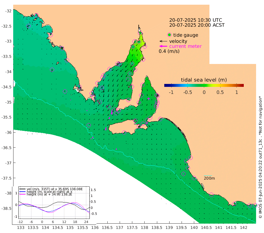 0cm/s -79T +10cm/s rms + 5cm/s 114T. SAM1DS 520m 3cm/s 176T +13cm/s rms + 5cm/s -36T. SAM2CP 100m 7cm/s 162T +21cm/s rms + 18cm/s 142T. SAM3MS 168m 6cm/s -168T +22cm/s rms + 0cm/s -30T. SAM4CY 117m 1cm/s 133T +23cm/s rms + 2cm/s 99T. SAM5CB 94m 10cm/s -152T +8cm/s rms + 3cm/s -172T. SAM6IS 83m 4cm/s 163T +11cm/s rms + 7cm/s 150T. SAM7DS 519m 26cm/s -175T +10cm/s rms + 2cm/s 87T. SAM8SG 47m 15cm/s -171T +20cm/s rms + 12cm/s -168T. NRSKAI 101m -25cm Warrnambool -25cm Port Fairy -26cm Portland -21cm Port Macdonnell -25cm Beachport -26cm Cape Rabelais (off) -25cm Robe -24cm Cape Jaffa -23cm Kingston -29cm Victor Harbor -27cm Vivonne Bay -22cm Kingscote -19cm American River -25cm Penneshaw -23cm Cape Jervis -16cm Second Valley -18cm Port Noarlunga -18cm Port Stanvac -17cm Brighton -18cm Glenelg -17cm Port Adelaide (Outer Harbor) -14cm Angus Inlet (Garden Island) -18cm Ardrossan -17cm Port Vincent -19cm Port Giles -23cm Stenhouse Bay -24cm Althorpe Island -20cm Pondalowie Bay -23cm Point Turton -24cm Port Victoria -22cm Cape Elizabeth -27cm Tiparra Reef Light -24cm Wallaroo -28cm Middle Bank 17cm Port Broughton -15cm Port Pirie -13cm Red Cliff Point (Beacon 5) -21cm Port Bonython -21cm Whyalla -23cm Western Shoal Beacon -17cm Franklin Harbor -35cm Franklin Harbor Entrance Beacon -36cm Arno Bay -37cm Port Neill -36cm Cape Hardy -36cm Tumby Bay -40cm Reevesby Island -37cm Port Lincoln -32cm Taylors Landing -27cm Whalers Bay -29cm Wedge Island Mooring -27cm Shelf Edge Mooring -31cm Coffin Bay Entrance Beacon -30cm Greenly Island -29cm Elliston -30cm Pearson Island -22cm Venus Bay -35cm Blanche Port (Streaky Bay) -37cm Thevenard -39cm St Francis Island