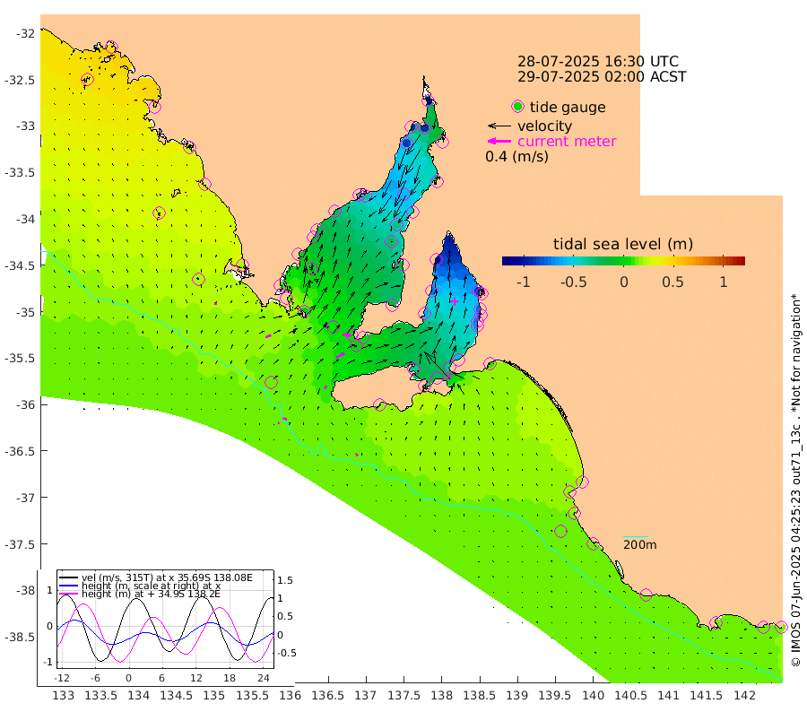 0cm/s 52T +10cm/s rms + 5cm/s 114T. SAM1DS 520m 9cm/s 66T +13cm/s rms + 5cm/s -36T. SAM2CP 100m 7cm/s 113T +21cm/s rms + 18cm/s 142T. SAM3MS 168m 5cm/s 148T +22cm/s rms + 0cm/s -30T. SAM4CY 117m 4cm/s 2T +23cm/s rms + 2cm/s 99T. SAM5CB 94m 17cm/s 60T +8cm/s rms + 3cm/s -172T. SAM6IS 83m 3cm/s 109T +11cm/s rms + 7cm/s 150T. SAM7DS 519m 14cm/s 94T +10cm/s rms + 2cm/s 87T. SAM8SG 47m 6cm/s 38T +20cm/s rms + 12cm/s -168T. NRSKAI 101m 13cm Warrnambool 13cm Port Fairy 14cm Portland 13cm Port Macdonnell 13cm Beachport 14cm Cape Rabelais (off) 15cm Robe 15cm Cape Jaffa 16cm Kingston 10cm Victor Harbor 15cm Vivonne Bay -40cm Kingscote -40cm American River -24cm Penneshaw -37cm Cape Jervis -58cm Second Valley -70cm Port Noarlunga -74cm Port Stanvac -76cm Brighton -77cm Glenelg -88cm Port Adelaide (Outer Harbor) -103cm Angus Inlet (Garden Island) -104cm Ardrossan -72cm Port Vincent -63cm Port Giles 4cm Stenhouse Bay -1cm Althorpe Island 5cm Pondalowie Bay -13cm Point Turton -13cm Port Victoria -24cm Cape Elizabeth -31cm Tiparra Reef Light -48cm Wallaroo -59cm Middle Bank -21cm Port Broughton -88cm Port Pirie -111cm Red Cliff Point (Beacon 5) -93cm Port Bonython -97cm Whyalla -90cm Western Shoal Beacon -48cm Franklin Harbor -37cm Franklin Harbor Entrance Beacon -22cm Arno Bay -16cm Port Neill -13cm Cape Hardy -6cm Tumby Bay -1cm Reevesby Island 9cm Port Lincoln 13cm Taylors Landing -6cm Whalers Bay 6cm Wedge Island Mooring 13cm Shelf Edge Mooring 22cm Coffin Bay Entrance Beacon 21cm Greenly Island 25cm Elliston 28cm Pearson Island 19cm Venus Bay 43cm Blanche Port (Streaky Bay) 44cm Thevenard 41cm St Francis Island