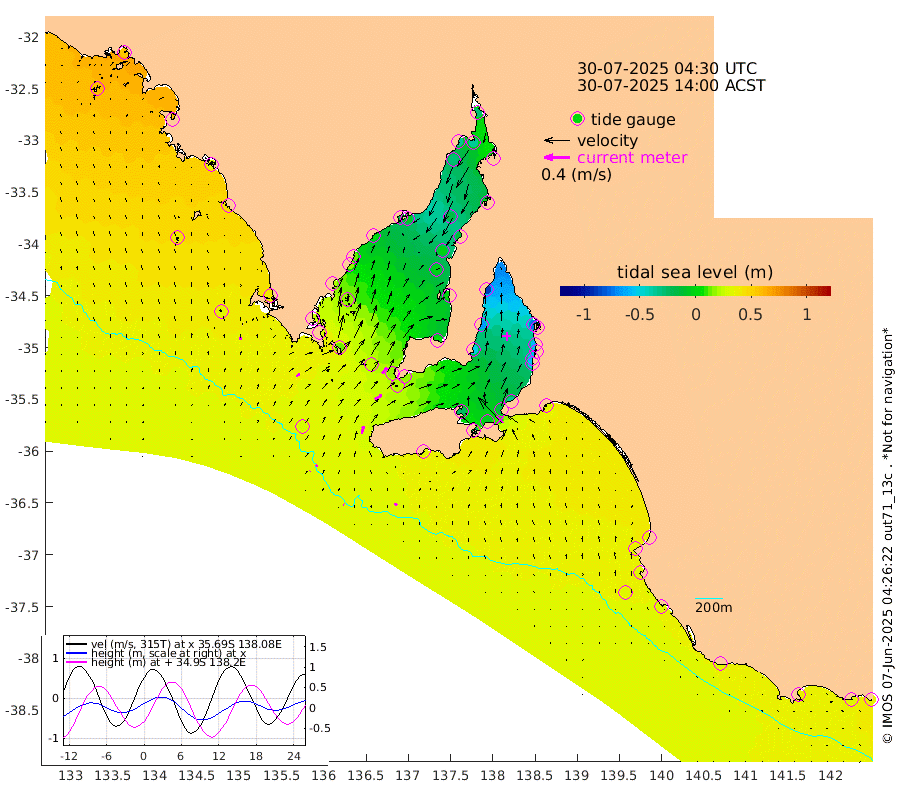 1cm/s -61T +10cm/s rms + 5cm/s 114T. SAM1DS 520m 6cm/s 56T +13cm/s rms + 5cm/s -36T. SAM2CP 100m 3cm/s 62T +21cm/s rms + 18cm/s 142T. SAM3MS 168m 5cm/s -36T +22cm/s rms + 0cm/s -30T. SAM4CY 117m 4cm/s 2T +23cm/s rms + 2cm/s 99T. SAM5CB 94m 12cm/s 61T +8cm/s rms + 3cm/s -172T. SAM6IS 83m 1cm/s 48T +11cm/s rms + 7cm/s 150T. SAM7DS 519m 11cm/s 39T +10cm/s rms + 2cm/s 87T. SAM8SG 47m 11cm/s 14T +20cm/s rms + 12cm/s -168T. NRSKAI 101m 36cm Warrnambool 33cm Port Fairy 34cm Portland 31cm Port Macdonnell 30cm Beachport 34cm Cape Rabelais (off) 33cm Robe 35cm Cape Jaffa 36cm Kingston 32cm Victor Harbor 32cm Vivonne Bay -23cm Kingscote -19cm American River -6cm Penneshaw -16cm Cape Jervis -35cm Second Valley -54cm Port Noarlunga -57cm Port Stanvac -59cm Brighton -59cm Glenelg -72cm Port Adelaide (Outer Harbor) -82cm Angus Inlet (Garden Island) -89cm Ardrossan -66cm Port Vincent -49cm Port Giles 16cm Stenhouse Bay 21cm Althorpe Island 17cm Pondalowie Bay 5cm Point Turton 1cm Port Victoria -3cm Cape Elizabeth -1cm Tiparra Reef Light -11cm Wallaroo -18cm Middle Bank 7cm Port Broughton -25cm Port Pirie -28cm Red Cliff Point (Beacon 5) -37cm Port Bonython -35cm Whyalla -27cm Western Shoal Beacon -20cm Franklin Harbor -6cm Franklin Harbor Entrance Beacon 2cm Arno Bay 12cm Port Neill 15cm Cape Hardy 21cm Tumby Bay 17cm Reevesby Island 25cm Port Lincoln 29cm Taylors Landing 12cm Whalers Bay 23cm Wedge Island Mooring 30cm Shelf Edge Mooring 39cm Coffin Bay Entrance Beacon 33cm Greenly Island 42cm Elliston 39cm Pearson Island 32cm Venus Bay 57cm Blanche Port (Streaky Bay) 56cm Thevenard 59cm St Francis Island