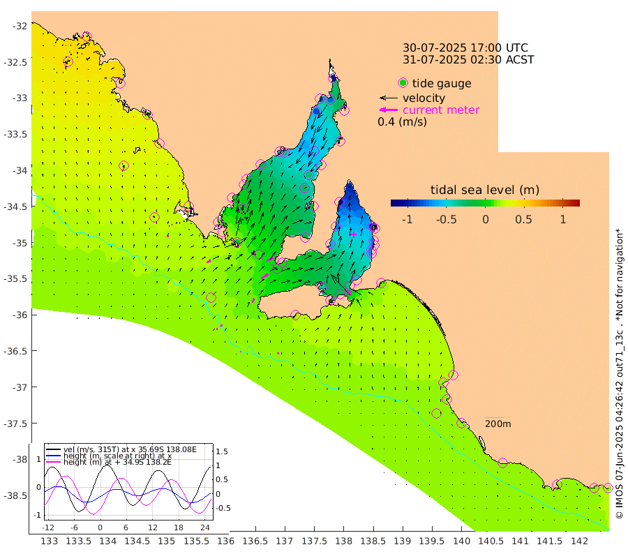 1cm/s 47T +10cm/s rms + 5cm/s 114T. SAM1DS 520m 10cm/s 62T +13cm/s rms + 5cm/s -36T. SAM2CP 100m 5cm/s 97T +21cm/s rms + 18cm/s 142T. SAM3MS 168m 4cm/s 107T +22cm/s rms + 0cm/s -30T. SAM4CY 117m 4cm/s 3T +23cm/s rms + 2cm/s 99T. SAM5CB 94m 17cm/s 56T +8cm/s rms + 3cm/s -172T. SAM6IS 83m 3cm/s 91T +11cm/s rms + 7cm/s 150T. SAM7DS 519m 15cm/s 68T +10cm/s rms + 2cm/s 87T. SAM8SG 47m 10cm/s 25T +20cm/s rms + 12cm/s -168T. NRSKAI 101m 18cm Warrnambool 18cm Port Fairy 18cm Portland 16cm Port Macdonnell 17cm Beachport 18cm Cape Rabelais (off) 18cm Robe 17cm Cape Jaffa 20cm Kingston 14cm Victor Harbor 20cm Vivonne Bay -39cm Kingscote -39cm American River -22cm Penneshaw -35cm Cape Jervis -57cm Second Valley -69cm Port Noarlunga -72cm Port Stanvac -76cm Brighton -75cm Glenelg -87cm Port Adelaide (Outer Harbor) -98cm Angus Inlet (Garden Island) -104cm Ardrossan -75cm Port Vincent -63cm Port Giles 4cm Stenhouse Bay 0cm Althorpe Island 6cm Pondalowie Bay -11cm Point Turton -12cm Port Victoria -23cm Cape Elizabeth -28cm Tiparra Reef Light -45cm Wallaroo -53cm Middle Bank -29cm Port Broughton -79cm Port Pirie -98cm Red Cliff Point (Beacon 5) -79cm Port Bonython -87cm Whyalla -83cm Western Shoal Beacon -46cm Franklin Harbor -31cm Franklin Harbor Entrance Beacon -17cm Arno Bay -9cm Port Neill -10cm Cape Hardy -3cm Tumby Bay 2cm Reevesby Island 12cm Port Lincoln 17cm Taylors Landing -6cm Whalers Bay 9cm Wedge Island Mooring 17cm Shelf Edge Mooring 26cm Coffin Bay Entrance Beacon 24cm Greenly Island 27cm Elliston 30cm Pearson Island 18cm Venus Bay 42cm Blanche Port (Streaky Bay) 45cm Thevenard 38cm St Francis Island