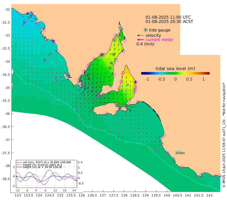 0cm/s 128T +10cm/s rms + 5cm/s 114T. SAM1DS 520m 5cm/s -135T +13cm/s rms + 5cm/s -36T. SAM2CP 100m 3cm/s -171T +21cm/s rms + 18cm/s 142T. SAM3MS 168m 5cm/s -171T +22cm/s rms + 0cm/s -30T. SAM4CY 117m 3cm/s 177T +23cm/s rms + 2cm/s 99T. SAM5CB 94m 11cm/s -134T +8cm/s rms + 3cm/s -172T. SAM6IS 83m 2cm/s -173T +11cm/s rms + 7cm/s 150T. SAM7DS 519m 18cm/s -157T +10cm/s rms + 2cm/s 87T. SAM8SG 47m 14cm/s -167T +20cm/s rms + 12cm/s -168T. NRSKAI 101m -34cm Warrnambool -33cm Port Fairy -33cm Portland -29cm Port Macdonnell -31cm Beachport -31cm Cape Rabelais (off) -32cm Robe -32cm Cape Jaffa -33cm Kingston -31cm Victor Harbor -32cm Vivonne Bay 14cm Kingscote 12cm American River -1cm Penneshaw 8cm Cape Jervis 24cm Second Valley 37cm Port Noarlunga 39cm Port Stanvac 43cm Brighton 41cm Glenelg 50cm Port Adelaide (Outer Harbor) 55cm Angus Inlet (Garden Island) 65cm Ardrossan 49cm Port Vincent 33cm Port Giles -17cm Stenhouse Bay -19cm Althorpe Island -18cm Pondalowie Bay -10cm Point Turton -8cm Port Victoria -3cm Cape Elizabeth -8cm Tiparra Reef Light 1cm Wallaroo 3cm Middle Bank 9cm Port Broughton 7cm Port Pirie 12cm Red Cliff Point (Beacon 5) 13cm Port Bonython 13cm Whyalla 9cm Western Shoal Beacon 6cm Franklin Harbor -7cm Franklin Harbor Entrance Beacon -12cm Arno Bay -15cm Port Neill -16cm Cape Hardy -20cm Tumby Bay -25cm Reevesby Island -29cm Port Lincoln -31cm Taylors Landing -14cm Whalers Bay -26cm Wedge Island Mooring -31cm Shelf Edge Mooring -38cm Coffin Bay Entrance Beacon -34cm Greenly Island -38cm Elliston -35cm Pearson Island -28cm Venus Bay -49cm Blanche Port (Streaky Bay) -51cm Thevenard -45cm St Francis Island