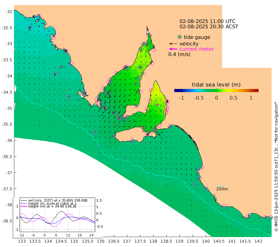 0cm/s 82T +10cm/s rms + 5cm/s 114T. SAM1DS 520m 4cm/s -146T +13cm/s rms + 5cm/s -36T. SAM2CP 100m 4cm/s 165T +21cm/s rms + 18cm/s 142T. SAM3MS 168m 5cm/s -174T +22cm/s rms + 0cm/s -30T. SAM4CY 117m 3cm/s 172T +23cm/s rms + 2cm/s 99T. SAM5CB 94m 9cm/s -145T +8cm/s rms + 3cm/s -172T. SAM6IS 83m 2cm/s 169T +11cm/s rms + 7cm/s 150T. SAM7DS 519m 19cm/s -166T +10cm/s rms + 2cm/s 87T. SAM8SG 47m 13cm/s -169T +20cm/s rms + 12cm/s -168T. NRSKAI 101m -33cm Warrnambool -31cm Port Fairy -31cm Portland -27cm Port Macdonnell -30cm Beachport -30cm Cape Rabelais (off) -30cm Robe -30cm Cape Jaffa -32cm Kingston -31cm Victor Harbor -31cm Vivonne Bay 4cm Kingscote 3cm American River -6cm Penneshaw 0cm Cape Jervis 13cm Second Valley 22cm Port Noarlunga 23cm Port Stanvac 27cm Brighton 25cm Glenelg 32cm Port Adelaide (Outer Harbor) 33cm Angus Inlet (Garden Island) 43cm Ardrossan 31cm Port Vincent 20cm Port Giles -18cm Stenhouse Bay -19cm Althorpe Island -19cm Pondalowie Bay -14cm Point Turton -12cm Port Victoria -9cm Cape Elizabeth -15cm Tiparra Reef Light -10cm Wallaroo -10cm Middle Bank 6cm Port Broughton -10cm Port Pirie -7cm Red Cliff Point (Beacon 5) -8cm Port Bonython -5cm Whyalla -7cm Western Shoal Beacon -3cm Franklin Harbor -16cm Franklin Harbor Entrance Beacon -18cm Arno Bay -21cm Port Neill -20cm Cape Hardy -23cm Tumby Bay -28cm Reevesby Island -29cm Port Lincoln -30cm Taylors Landing -16cm Whalers Bay -26cm Wedge Island Mooring -30cm Shelf Edge Mooring -36cm Coffin Bay Entrance Beacon -32cm Greenly Island -34cm Elliston -32cm Pearson Island -26cm Venus Bay -43cm Blanche Port (Streaky Bay) -45cm Thevenard -36cm St Francis Island