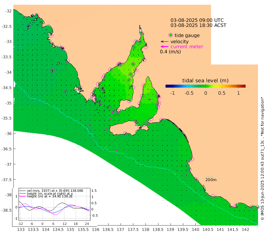 0cm/s -70T +10cm/s rms + 5cm/s 114T. SAM1DS 520m 4cm/s -153T +13cm/s rms + 5cm/s -36T. SAM2CP 100m 5cm/s 170T +21cm/s rms + 18cm/s 142T. SAM3MS 168m 7cm/s -132T +22cm/s rms + 0cm/s -30T. SAM4CY 117m 2cm/s 171T +23cm/s rms + 2cm/s 99T. SAM5CB 94m 9cm/s -155T +8cm/s rms + 3cm/s -172T. SAM6IS 83m 3cm/s 169T +11cm/s rms + 7cm/s 150T. SAM7DS 519m 18cm/s -170T +10cm/s rms + 2cm/s 87T. SAM8SG 47m 10cm/s -171T +20cm/s rms + 12cm/s -168T. NRSKAI 101m -8cm Warrnambool -9cm Port Fairy -10cm Portland -4cm Port Macdonnell -12cm Beachport -12cm Cape Rabelais (off) -10cm Robe -8cm Cape Jaffa -9cm Kingston -13cm Victor Harbor -16cm Vivonne Bay -2cm Kingscote -1cm American River -4cm Penneshaw -3cm Cape Jervis 4cm Second Valley 3cm Port Noarlunga 5cm Port Stanvac 6cm Brighton 6cm Glenelg 7cm Port Adelaide (Outer Harbor) 2cm Angus Inlet (Garden Island) 8cm Ardrossan 3cm Port Vincent 7cm Port Giles -4cm Stenhouse Bay -3cm Althorpe Island -5cm Pondalowie Bay 3cm Point Turton 2cm Port Victoria 2cm Cape Elizabeth -1cm Tiparra Reef Light -1cm Wallaroo -4cm Middle Bank 19cm Port Broughton -13cm Port Pirie -14cm Red Cliff Point (Beacon 5) -20cm Port Bonython -12cm Whyalla -9cm Western Shoal Beacon 7cm Franklin Harbor -2cm Franklin Harbor Entrance Beacon -5cm Arno Bay -4cm Port Neill -7cm Cape Hardy -8cm Tumby Bay -14cm Reevesby Island -10cm Port Lincoln -13cm Taylors Landing -1cm Whalers Bay -9cm Wedge Island Mooring -15cm Shelf Edge Mooring -16cm Coffin Bay Entrance Beacon -17cm Greenly Island -14cm Elliston -18cm Pearson Island -8cm Venus Bay -17cm Blanche Port (Streaky Bay) -19cm Thevenard -17cm St Francis Island