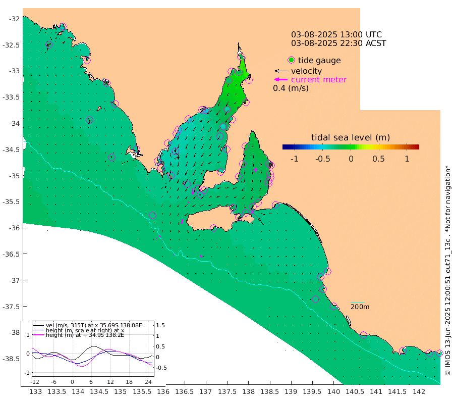 1cm/s 99T +10cm/s rms + 5cm/s 114T. SAM1DS 520m 2cm/s 139T +13cm/s rms + 5cm/s -36T. SAM2CP 100m 5cm/s 143T +21cm/s rms + 18cm/s 142T. SAM3MS 168m 7cm/s 142T +22cm/s rms + 0cm/s -30T. SAM4CY 117m 1cm/s 82T +23cm/s rms + 2cm/s 99T. SAM5CB 94m 3cm/s -153T +8cm/s rms + 3cm/s -172T. SAM6IS 83m 2cm/s 155T +11cm/s rms + 7cm/s 150T. SAM7DS 519m 18cm/s -178T +10cm/s rms + 2cm/s 87T. SAM8SG 47m 14cm/s -171T +20cm/s rms + 12cm/s -168T. NRSKAI 101m -38cm Warrnambool -35cm Port Fairy -35cm Portland -35cm Port Macdonnell -32cm Beachport -32cm Cape Rabelais (off) -33cm Robe -34cm Cape Jaffa -36cm Kingston -35cm Victor Harbor -30cm Vivonne Bay -23cm Kingscote -23cm American River -30cm Penneshaw -23cm Cape Jervis -20cm Second Valley -17cm Port Noarlunga -19cm Port Stanvac -15cm Brighton -18cm Glenelg -15cm Port Adelaide (Outer Harbor) -8cm Angus Inlet (Garden Island) -13cm Ardrossan -16cm Port Vincent -24cm Port Giles -32cm Stenhouse Bay -34cm Althorpe Island -30cm Pondalowie Bay -40cm Point Turton -37cm Port Victoria -37cm Cape Elizabeth -43cm Tiparra Reef Light -36cm Wallaroo -39cm Middle Bank -6cm Port Broughton -21cm Port Pirie -20cm Red Cliff Point (Beacon 5) -24cm Port Bonython -27cm Whyalla -30cm Western Shoal Beacon -37cm Franklin Harbor -50cm Franklin Harbor Entrance Beacon -47cm Arno Bay -52cm Port Neill -45cm Cape Hardy -44cm Tumby Bay -45cm Reevesby Island -44cm Port Lincoln -39cm Taylors Landing -36cm Whalers Bay -37cm Wedge Island Mooring -31cm Shelf Edge Mooring -37cm Coffin Bay Entrance Beacon -29cm Greenly Island -33cm Elliston -27cm Pearson Island -29cm Venus Bay -41cm Blanche Port (Streaky Bay) -40cm Thevenard -30cm St Francis Island