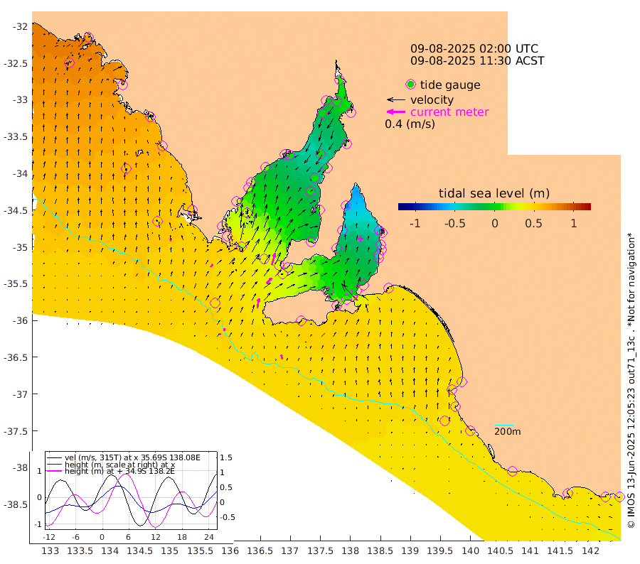 1cm/s -49T +10cm/s rms + 5cm/s 114T. SAM1DS 520m 8cm/s 36T +13cm/s rms + 5cm/s -36T. SAM2CP 100m 6cm/s 3T +21cm/s rms + 18cm/s 142T. SAM3MS 168m 9cm/s -13T +22cm/s rms + 0cm/s -30T. SAM4CY 117m 6cm/s -4T +23cm/s rms + 2cm/s 99T. SAM5CB 94m 16cm/s 42T +8cm/s rms + 3cm/s -172T. SAM6IS 83m 3cm/s -19T +11cm/s rms + 7cm/s 150T. SAM7DS 519m 27cm/s 16T +10cm/s rms + 2cm/s 87T. SAM8SG 47m 21cm/s 10T +20cm/s rms + 12cm/s -168T. NRSKAI 101m 41cm Warrnambool 40cm Port Fairy 43cm Portland 38cm Port Macdonnell 45cm Beachport 47cm Cape Rabelais (off) 44cm Robe 46cm Cape Jaffa 45cm Kingston 46cm Victor Harbor 49cm Vivonne Bay -6cm Kingscote -3cm American River 8cm Penneshaw -1cm Cape Jervis -18cm Second Valley -38cm Port Noarlunga -41cm Port Stanvac -40cm Brighton -43cm Glenelg -54cm Port Adelaide (Outer Harbor) -58cm Angus Inlet (Garden Island) -72cm Ardrossan -49cm Port Vincent -36cm Port Giles 26cm Stenhouse Bay 31cm Althorpe Island 27cm Pondalowie Bay 8cm Point Turton 7cm Port Victoria 4cm Cape Elizabeth 7cm Tiparra Reef Light 2cm Wallaroo 1cm Middle Bank 3cm Port Broughton 11cm Port Pirie 9cm Red Cliff Point (Beacon 5) 2cm Port Bonython 0cm Whyalla 1cm Western Shoal Beacon -15cm Franklin Harbor 5cm Franklin Harbor Entrance Beacon 14cm Arno Bay 20cm Port Neill 26cm Cape Hardy 32cm Tumby Bay 29cm Reevesby Island 37cm Port Lincoln 44cm Taylors Landing 20cm Whalers Bay 37cm Wedge Island Mooring 48cm Shelf Edge Mooring 54cm Coffin Bay Entrance Beacon 51cm Greenly Island 58cm Elliston 58cm Pearson Island 39cm Venus Bay 69cm Blanche Port (Streaky Bay) 70cm Thevenard 69cm St Francis Island