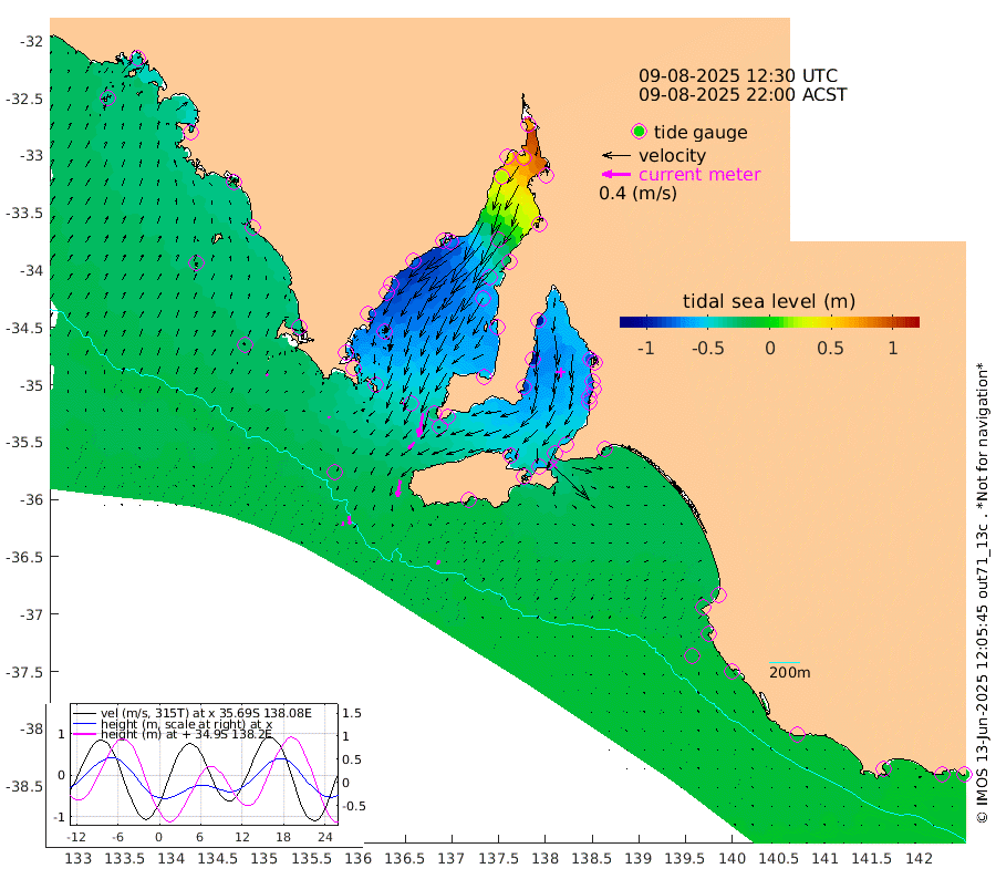0cm/s -107T +10cm/s rms + 5cm/s 114T. SAM1DS 520m 3cm/s 131T +13cm/s rms + 5cm/s -36T. SAM2CP 100m 11cm/s 176T +21cm/s rms + 18cm/s 142T. SAM3MS 168m 6cm/s -161T +22cm/s rms + 0cm/s -30T. SAM4CY 117m 4cm/s 37T +23cm/s rms + 2cm/s 99T. SAM5CB 94m 13cm/s -139T +8cm/s rms + 3cm/s -172T. SAM6IS 83m 5cm/s -179T +11cm/s rms + 7cm/s 150T. SAM7DS 519m 33cm/s -170T +10cm/s rms + 2cm/s 87T. SAM8SG 47m 23cm/s -170T +20cm/s rms + 12cm/s -168T. NRSKAI 101m -11cm Warrnambool -13cm Port Fairy -13cm Portland -18cm Port Macdonnell -15cm Beachport -16cm Cape Rabelais (off) -16cm Robe -19cm Cape Jaffa -17cm Kingston -26cm Victor Harbor -19cm Vivonne Bay -55cm Kingscote -47cm American River -57cm Penneshaw -49cm Cape Jervis -55cm Second Valley -70cm Port Noarlunga -73cm Port Stanvac -72cm Brighton -77cm Glenelg -80cm Port Adelaide (Outer Harbor) -47cm Angus Inlet (Garden Island) -100cm Ardrossan -98cm Port Vincent -86cm Port Giles -41cm Stenhouse Bay -39cm Althorpe Island -30cm Pondalowie Bay -49cm Point Turton -53cm Port Victoria -54cm Cape Elizabeth -45cm Tiparra Reef Light -23cm Wallaroo -28cm Middle Bank 52cm Port Broughton 72cm Port Pirie 70cm Red Cliff Point (Beacon 5) 52cm Port Bonython 37cm Whyalla 21cm Western Shoal Beacon -39cm Franklin Harbor -74cm Franklin Harbor Entrance Beacon -76cm Arno Bay -82cm Port Neill -77cm Cape Hardy -75cm Tumby Bay -66cm Reevesby Island -64cm Port Lincoln -46cm Taylors Landing -51cm Whalers Bay -40cm Wedge Island Mooring -20cm Shelf Edge Mooring -30cm Coffin Bay Entrance Beacon -23cm Greenly Island -30cm Elliston -24cm Pearson Island -26cm Venus Bay -42cm Blanche Port (Streaky Bay) -41cm Thevenard -34cm St Francis Island