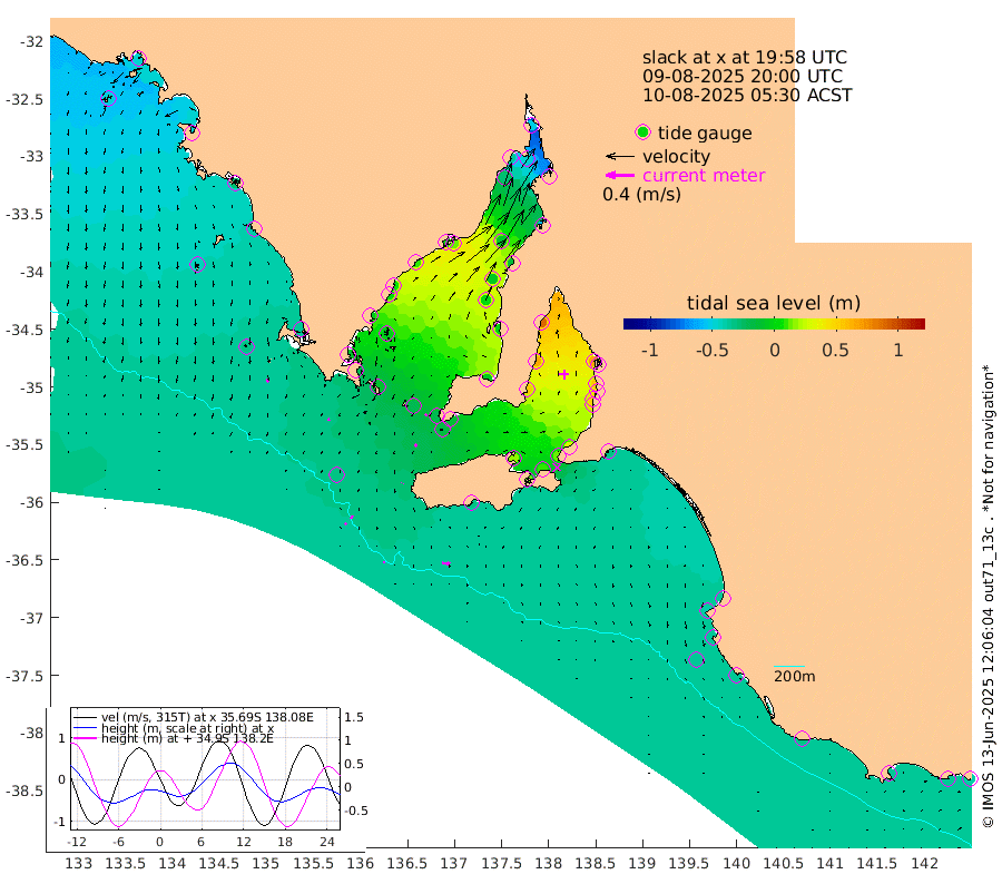 2cm/s 114T +10cm/s rms + 5cm/s 114T. SAM1DS 520m 3cm/s -122T +13cm/s rms + 5cm/s -36T. SAM2CP 100m 4cm/s 14T +21cm/s rms + 18cm/s 142T. SAM3MS 168m 11cm/s 96T +22cm/s rms + 0cm/s -30T. SAM4CY 117m 5cm/s -177T +23cm/s rms + 2cm/s 99T. SAM5CB 94m 3cm/s -121T +8cm/s rms + 3cm/s -172T. SAM6IS 83m 3cm/s 32T +11cm/s rms + 7cm/s 150T. SAM7DS 519m 3cm/s 41T +10cm/s rms + 2cm/s 87T. SAM8SG 47m 1cm/s -172T +20cm/s rms + 12cm/s -168T. NRSKAI 101m -38cm Warrnambool -35cm Port Fairy -36cm Portland -33cm Port Macdonnell -34cm Beachport -37cm Cape Rabelais (off) -35cm Robe -38cm Cape Jaffa -37cm Kingston -31cm Victor Harbor -31cm Vivonne Bay 17cm Kingscote 12cm American River 10cm Penneshaw 14cm Cape Jervis 28cm Second Valley 48cm Port Noarlunga 52cm Port Stanvac 51cm Brighton 55cm Glenelg 66cm Port Adelaide (Outer Harbor) 54cm Angus Inlet (Garden Island) 87cm Ardrossan 65cm Port Vincent 53cm Port Giles -13cm Stenhouse Bay -19cm Althorpe Island -20cm Pondalowie Bay -5cm Point Turton -2cm Port Victoria 1cm Cape Elizabeth -5cm Tiparra Reef Light -13cm Wallaroo -8cm Middle Bank -60cm Port Broughton -61cm Port Pirie -52cm Red Cliff Point (Beacon 5) -45cm Port Bonython -36cm Whyalla -28cm Western Shoal Beacon 7cm Franklin Harbor 13cm Franklin Harbor Entrance Beacon 8cm Arno Bay 4cm Port Neill 1cm Cape Hardy -4cm Tumby Bay -5cm Reevesby Island -11cm Port Lincoln -21cm Taylors Landing -8cm Whalers Bay -21cm Wedge Island Mooring -34cm Shelf Edge Mooring -37cm Coffin Bay Entrance Beacon -33cm Greenly Island -39cm Elliston -42cm Pearson Island -30cm Venus Bay -47cm Blanche Port (Streaky Bay) -45cm Thevenard -46cm St Francis Island
