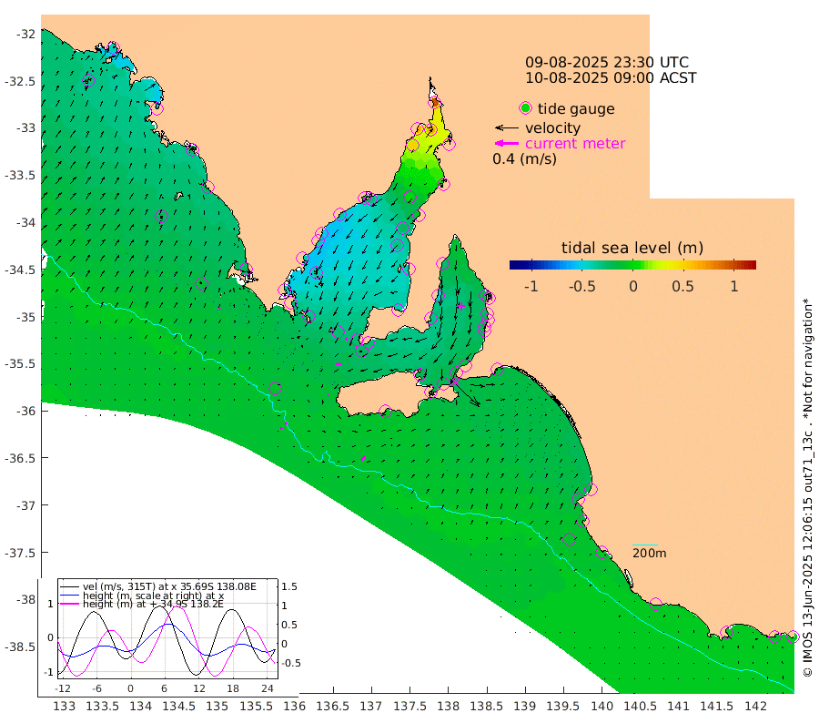 1cm/s 113T +10cm/s rms + 5cm/s 114T. SAM1DS 520m 1cm/s -12T +13cm/s rms + 5cm/s -36T. SAM2CP 100m 4cm/s -35T +21cm/s rms + 18cm/s 142T. SAM3MS 168m 9cm/s 43T +22cm/s rms + 0cm/s -30T. SAM4CY 117m 3cm/s 40T +23cm/s rms + 2cm/s 99T. SAM5CB 94m 8cm/s -104T +8cm/s rms + 3cm/s -172T. SAM6IS 83m 3cm/s -48T +11cm/s rms + 7cm/s 150T. SAM7DS 519m 5cm/s -47T +10cm/s rms + 2cm/s 87T. SAM8SG 47m 2cm/s -115T +20cm/s rms + 12cm/s -168T. NRSKAI 101m -7cm Warrnambool -8cm Port Fairy -7cm Portland -16cm Port Macdonnell -7cm Beachport -10cm Cape Rabelais (off) -12cm Robe -15cm Cape Jaffa -16cm Kingston -12cm Victor Harbor -6cm Vivonne Bay -21cm Kingscote -16cm American River -21cm Penneshaw -13cm Cape Jervis -11cm Second Valley -21cm Port Noarlunga -21cm Port Stanvac -18cm Brighton -23cm Glenelg -19cm Port Adelaide (Outer Harbor) 6cm Angus Inlet (Garden Island) -27cm Ardrossan -48cm Port Vincent -33cm Port Giles -29cm Stenhouse Bay -25cm Althorpe Island -26cm Pondalowie Bay -39cm Point Turton -39cm Port Victoria -33cm Cape Elizabeth -24cm Tiparra Reef Light -5cm Wallaroo 3cm Middle Bank -5cm Port Broughton 74cm Port Pirie 95cm Red Cliff Point (Beacon 5) 61cm Port Bonython 60cm Whyalla 50cm Western Shoal Beacon -17cm Franklin Harbor -30cm Franklin Harbor Entrance Beacon -37cm Arno Bay -49cm Port Neill -40cm Cape Hardy -40cm Tumby Bay -38cm Reevesby Island -39cm Port Lincoln -28cm Taylors Landing -34cm Whalers Bay -26cm Wedge Island Mooring -10cm Shelf Edge Mooring -25cm Coffin Bay Entrance Beacon -13cm Greenly Island -24cm Elliston -24cm Pearson Island -29cm Venus Bay -48cm Blanche Port (Streaky Bay) -44cm Thevenard -31cm St Francis Island