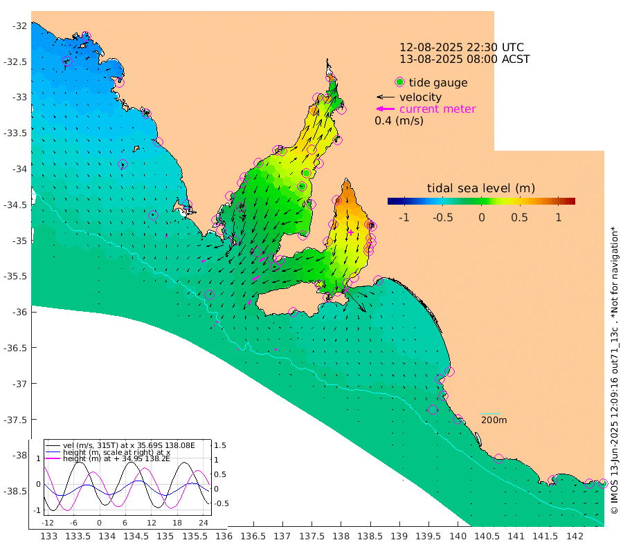 1cm/s 146T +10cm/s rms + 5cm/s 114T. SAM1DS 520m 9cm/s -119T +13cm/s rms + 5cm/s -36T. SAM2CP 100m 4cm/s -64T +21cm/s rms + 18cm/s 142T. SAM3MS 168m 5cm/s 79T +22cm/s rms + 0cm/s -30T. SAM4CY 117m 4cm/s 178T +23cm/s rms + 2cm/s 99T. SAM5CB 94m 16cm/s -123T +8cm/s rms + 3cm/s -172T. SAM6IS 83m 2cm/s -50T +11cm/s rms + 7cm/s 150T. SAM7DS 519m 13cm/s -123T +10cm/s rms + 2cm/s 87T. SAM8SG 47m 11cm/s -160T +20cm/s rms + 12cm/s -168T. NRSKAI 101m -32cm Warrnambool -32cm Port Fairy -32cm Portland -34cm Port Macdonnell -31cm Beachport -34cm Cape Rabelais (off) -33cm Robe -37cm Cape Jaffa -36cm Kingston -30cm Victor Harbor -32cm Vivonne Bay 26cm Kingscote 26cm American River 10cm Penneshaw 24cm Cape Jervis 44cm Second Valley 60cm Port Noarlunga 64cm Port Stanvac 67cm Brighton 67cm Glenelg 81cm Port Adelaide (Outer Harbor) 95cm Angus Inlet (Garden Island) 99cm Ardrossan 68cm Port Vincent 53cm Port Giles -20cm Stenhouse Bay -18cm Althorpe Island -22cm Pondalowie Bay -8cm Point Turton -6cm Port Victoria 3cm Cape Elizabeth 11cm Tiparra Reef Light 25cm Wallaroo 34cm Middle Bank -5cm Port Broughton 59cm Port Pirie 81cm Red Cliff Point (Beacon 5) 66cm Port Bonython 68cm Whyalla 64cm Western Shoal Beacon 31cm Franklin Harbor 15cm Franklin Harbor Entrance Beacon 0cm Arno Bay -9cm Port Neill -13cm Cape Hardy -20cm Tumby Bay -16cm Reevesby Island -29cm Port Lincoln -33cm Taylors Landing -13cm Whalers Bay -26cm Wedge Island Mooring -31cm Shelf Edge Mooring -42cm Coffin Bay Entrance Beacon -38cm Greenly Island -47cm Elliston -48cm Pearson Island -35cm Venus Bay -66cm Blanche Port (Streaky Bay) -65cm Thevenard -56cm St Francis Island