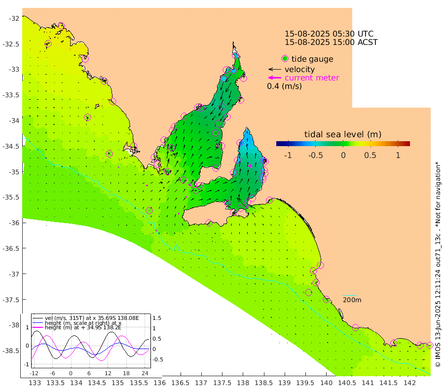 1cm/s -63T +10cm/s rms + 5cm/s 114T. SAM1DS 520m 5cm/s 70T +13cm/s rms + 5cm/s -36T. SAM2CP 100m 4cm/s 125T +21cm/s rms + 18cm/s 142T. SAM3MS 168m 3cm/s -101T +22cm/s rms + 0cm/s -30T. SAM4CY 117m 1cm/s 22T +23cm/s rms + 2cm/s 99T. SAM5CB 94m 7cm/s 85T +8cm/s rms + 3cm/s -172T. SAM6IS 83m 2cm/s 141T +11cm/s rms + 7cm/s 150T. SAM7DS 519m 7cm/s 121T +10cm/s rms + 2cm/s 87T. SAM8SG 47m 4cm/s 24T +20cm/s rms + 12cm/s -168T. NRSKAI 101m 21cm Warrnambool 19cm Port Fairy 18cm Portland 20cm Port Macdonnell 15cm Beachport 16cm Cape Rabelais (off) 18cm Robe 21cm Cape Jaffa 22cm Kingston 15cm Victor Harbor 13cm Vivonne Bay -27cm Kingscote -24cm American River -13cm Penneshaw -23cm Cape Jervis -36cm Second Valley -50cm Port Noarlunga -52cm Port Stanvac -56cm Brighton -55cm Glenelg -64cm Port Adelaide (Outer Harbor) -80cm Angus Inlet (Garden Island) -78cm Ardrossan -55cm Port Vincent -43cm Port Giles 7cm Stenhouse Bay 8cm Althorpe Island 9cm Pondalowie Bay 3cm Point Turton -1cm Port Victoria -3cm Cape Elizabeth -7cm Tiparra Reef Light -20cm Wallaroo -27cm Middle Bank 5cm Port Broughton -49cm Port Pirie -55cm Red Cliff Point (Beacon 5) -60cm Port Bonython -55cm Whyalla -47cm Western Shoal Beacon -17cm Franklin Harbor -11cm Franklin Harbor Entrance Beacon -5cm Arno Bay 2cm Port Neill 4cm Cape Hardy 9cm Tumby Bay 6cm Reevesby Island 13cm Port Lincoln 15cm Taylors Landing 4cm Whalers Bay 11cm Wedge Island Mooring 12cm Shelf Edge Mooring 22cm Coffin Bay Entrance Beacon 15cm Greenly Island 23cm Elliston 18cm Pearson Island 20cm Venus Bay 37cm Blanche Port (Streaky Bay) 35cm Thevenard 28cm St Francis Island