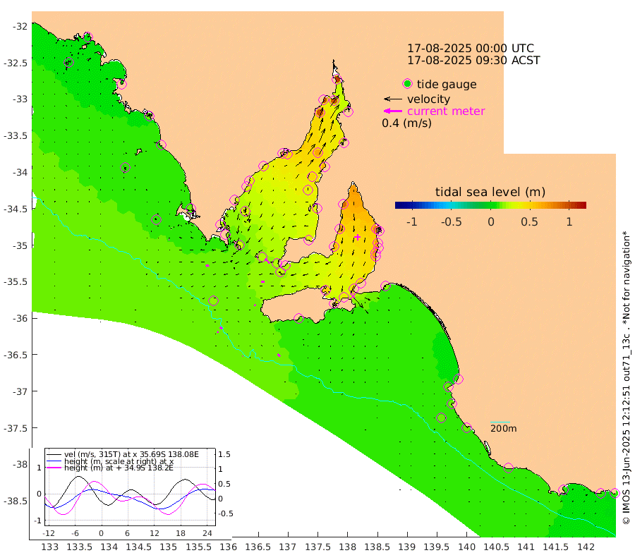 1cm/s -136T +10cm/s rms + 5cm/s 114T. SAM1DS 520m 7cm/s -101T +13cm/s rms + 5cm/s -36T. SAM2CP 100m 6cm/s -62T +21cm/s rms + 18cm/s 142T. SAM3MS 168m 7cm/s -46T +22cm/s rms + 0cm/s -30T. SAM4CY 117m 2cm/s -96T +23cm/s rms + 2cm/s 99T. SAM5CB 94m 7cm/s -97T +8cm/s rms + 3cm/s -172T. SAM6IS 83m 3cm/s -61T +11cm/s rms + 7cm/s 150T. SAM7DS 519m 14cm/s -43T +10cm/s rms + 2cm/s 87T. SAM8SG 47m 3cm/s -28T +20cm/s rms + 12cm/s -168T. NRSKAI 101m 8cm Warrnambool 8cm Port Fairy 11cm Portland 9cm Port Macdonnell 12cm Beachport 13cm Cape Rabelais (off) 12cm Robe 12cm Cape Jaffa 10cm Kingston 17cm Victor Harbor 11cm Vivonne Bay 50cm Kingscote 50cm American River 39cm Penneshaw 46cm Cape Jervis 57cm Second Valley 65cm Port Noarlunga 68cm Port Stanvac 71cm Brighton 71cm Glenelg 77cm Port Adelaide (Outer Harbor) 87cm Angus Inlet (Garden Island) 88cm Ardrossan 75cm Port Vincent 61cm Port Giles 20cm Stenhouse Bay 26cm Althorpe Island 19cm Pondalowie Bay 30cm Point Turton 31cm Port Victoria 37cm Cape Elizabeth 47cm Tiparra Reef Light 60cm Wallaroo 67cm Middle Bank 32cm Port Broughton 95cm Port Pirie 103cm Red Cliff Point (Beacon 5) 97cm Port Bonython 99cm Whyalla 94cm Western Shoal Beacon 53cm Franklin Harbor 49cm Franklin Harbor Entrance Beacon 40cm Arno Bay 35cm Port Neill 33cm Cape Hardy 28cm Tumby Bay 31cm Reevesby Island 21cm Port Lincoln 17cm Taylors Landing 29cm Whalers Bay 21cm Wedge Island Mooring 16cm Shelf Edge Mooring 13cm Coffin Bay Entrance Beacon 11cm Greenly Island 11cm Elliston 10cm Pearson Island 11cm Venus Bay 7cm Blanche Port (Streaky Bay) 5cm Thevenard 7cm St Francis Island