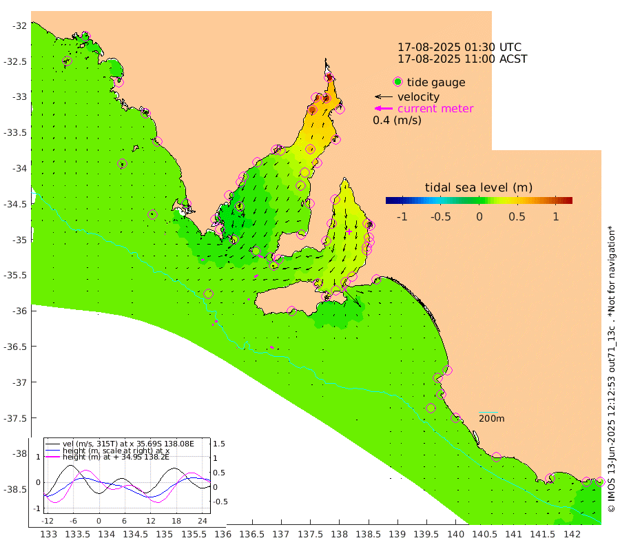 1cm/s -127T +10cm/s rms + 5cm/s 114T. SAM1DS 520m 6cm/s -112T +13cm/s rms + 5cm/s -36T. SAM2CP 100m 5cm/s -92T +21cm/s rms + 18cm/s 142T. SAM3MS 168m 8cm/s -59T +22cm/s rms + 0cm/s -30T. SAM4CY 117m 1cm/s -63T +23cm/s rms + 2cm/s 99T. SAM5CB 94m 9cm/s -114T +8cm/s rms + 3cm/s -172T. SAM6IS 83m 3cm/s -93T +11cm/s rms + 7cm/s 150T. SAM7DS 519m 11cm/s -74T +10cm/s rms + 2cm/s 87T. SAM8SG 47m 4cm/s -142T +20cm/s rms + 12cm/s -168T. NRSKAI 101m 14cm Warrnambool 14cm Port Fairy 15cm Portland 12cm Port Macdonnell 14cm Beachport 15cm Cape Rabelais (off) 14cm Robe 16cm Cape Jaffa 14cm Kingston 17cm Victor Harbor 12cm Vivonne Bay 29cm Kingscote 32cm American River 21cm Penneshaw 29cm Cape Jervis 33cm Second Valley 33cm Port Noarlunga 34cm Port Stanvac 36cm Brighton 35cm Glenelg 37cm Port Adelaide (Outer Harbor) 53cm Angus Inlet (Garden Island) 38cm Ardrossan 31cm Port Vincent 25cm Port Giles 11cm Stenhouse Bay 19cm Althorpe Island 14cm Pondalowie Bay 19cm Point Turton 19cm Port Victoria 24cm Cape Elizabeth 37cm Tiparra Reef Light 54cm Wallaroo 59cm Middle Bank 49cm Port Broughton 111cm Port Pirie 121cm Red Cliff Point (Beacon 5) 103cm Port Bonython 103cm Whyalla 97cm Western Shoal Beacon 41cm Franklin Harbor 30cm Franklin Harbor Entrance Beacon 21cm Arno Bay 17cm Port Neill 18cm Cape Hardy 15cm Tumby Bay 20cm Reevesby Island 11cm Port Lincoln 10cm Taylors Landing 19cm Whalers Bay 15cm Wedge Island Mooring 16cm Shelf Edge Mooring 14cm Coffin Bay Entrance Beacon 12cm Greenly Island 13cm Elliston 12cm Pearson Island 13cm Venus Bay 11cm Blanche Port (Streaky Bay) 10cm Thevenard 17cm St Francis Island