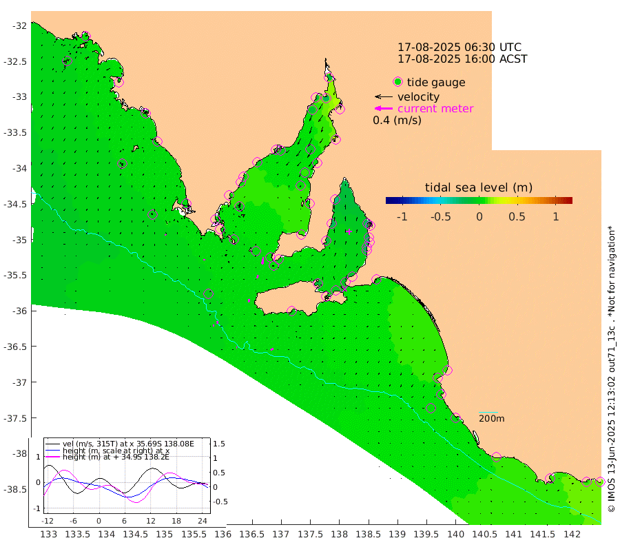 1cm/s -72T +10cm/s rms + 5cm/s 114T. SAM1DS 520m 2cm/s -177T +13cm/s rms + 5cm/s -36T. SAM2CP 100m 6cm/s 172T +21cm/s rms + 18cm/s 142T. SAM3MS 168m 7cm/s -120T +22cm/s rms + 0cm/s -30T. SAM4CY 117m 2cm/s 169T +23cm/s rms + 2cm/s 99T. SAM5CB 94m 8cm/s -164T +8cm/s rms + 3cm/s -172T. SAM6IS 83m 3cm/s 170T +11cm/s rms + 7cm/s 150T. SAM7DS 519m 16cm/s -172T +10cm/s rms + 2cm/s 87T. SAM8SG 47m 7cm/s -172T +20cm/s rms + 12cm/s -168T. NRSKAI 101m 13cm Warrnambool 11cm Port Fairy 8cm Portland 12cm Port Macdonnell 3cm Beachport 4cm Cape Rabelais (off) 7cm Robe 9cm Cape Jaffa 10cm Kingston 2cm Victor Harbor -3cm Vivonne Bay -12cm Kingscote -9cm American River -7cm Penneshaw -10cm Cape Jervis -14cm Second Valley -19cm Port Noarlunga -20cm Port Stanvac -23cm Brighton -22cm Glenelg -25cm Port Adelaide (Outer Harbor) -32cm Angus Inlet (Garden Island) -30cm Ardrossan -25cm Port Vincent -16cm Port Giles 2cm Stenhouse Bay 4cm Althorpe Island 4cm Pondalowie Bay 11cm Point Turton 6cm Port Victoria 6cm Cape Elizabeth 8cm Tiparra Reef Light 3cm Wallaroo -2cm Middle Bank 28cm Port Broughton -10cm Port Pirie -15cm Red Cliff Point (Beacon 5) -19cm Port Bonython -14cm Whyalla -9cm Western Shoal Beacon 6cm Franklin Harbor 0cm Franklin Harbor Entrance Beacon -1cm Arno Bay 4cm Port Neill 2cm Cape Hardy 1cm Tumby Bay 0cm Reevesby Island 1cm Port Lincoln -1cm Taylors Landing 4cm Whalers Bay 1cm Wedge Island Mooring -3cm Shelf Edge Mooring 2cm Coffin Bay Entrance Beacon -4cm Greenly Island 1cm Elliston -4cm Pearson Island 7cm Venus Bay 7cm Blanche Port (Streaky Bay) 4cm Thevenard 5cm St Francis Island
