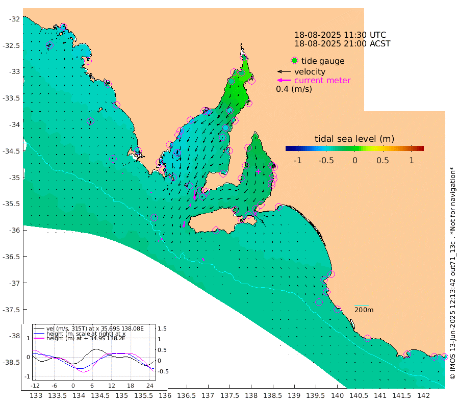 0cm/s 100T +10cm/s rms + 5cm/s 114T. SAM1DS 520m 2cm/s 148T +13cm/s rms + 5cm/s -36T. SAM2CP 100m 7cm/s 146T +21cm/s rms + 18cm/s 142T. SAM3MS 168m 9cm/s 151T +22cm/s rms + 0cm/s -30T. SAM4CY 117m 1cm/s 98T +23cm/s rms + 2cm/s 99T. SAM5CB 94m 8cm/s -156T +8cm/s rms + 3cm/s -172T. SAM6IS 83m 3cm/s 153T +11cm/s rms + 7cm/s 150T. SAM7DS 519m 28cm/s -177T +10cm/s rms + 2cm/s 87T. SAM8SG 47m 18cm/s -171T +20cm/s rms + 12cm/s -168T. NRSKAI 101m -45cm Warrnambool -44cm Port Fairy -44cm Portland -41cm Port Macdonnell -40cm Beachport -41cm Cape Rabelais (off) -41cm Robe -43cm Cape Jaffa -42cm Kingston -44cm Victor Harbor -38cm Vivonne Bay -30cm Kingscote -28cm American River -38cm Penneshaw -31cm Cape Jervis -25cm Second Valley -23cm Port Noarlunga -24cm Port Stanvac -20cm Brighton -22cm Glenelg -20cm Port Adelaide (Outer Harbor) -11cm Angus Inlet (Garden Island) -19cm Ardrossan -20cm Port Vincent -28cm Port Giles -38cm Stenhouse Bay -41cm Althorpe Island -35cm Pondalowie Bay -45cm Point Turton -45cm Port Victoria -44cm Cape Elizabeth -49cm Tiparra Reef Light -43cm Wallaroo -47cm Middle Bank 1cm Port Broughton -24cm Port Pirie -23cm Red Cliff Point (Beacon 5) -27cm Port Bonython -32cm Whyalla -35cm Western Shoal Beacon -39cm Franklin Harbor -58cm Franklin Harbor Entrance Beacon -57cm Arno Bay -60cm Port Neill -57cm Cape Hardy -57cm Tumby Bay -57cm Reevesby Island -55cm Port Lincoln -48cm Taylors Landing -44cm Whalers Bay -45cm Wedge Island Mooring -39cm Shelf Edge Mooring -45cm Coffin Bay Entrance Beacon -41cm Greenly Island -44cm Elliston -40cm Pearson Island -36cm Venus Bay -53cm Blanche Port (Streaky Bay) -52cm Thevenard -52cm St Francis Island