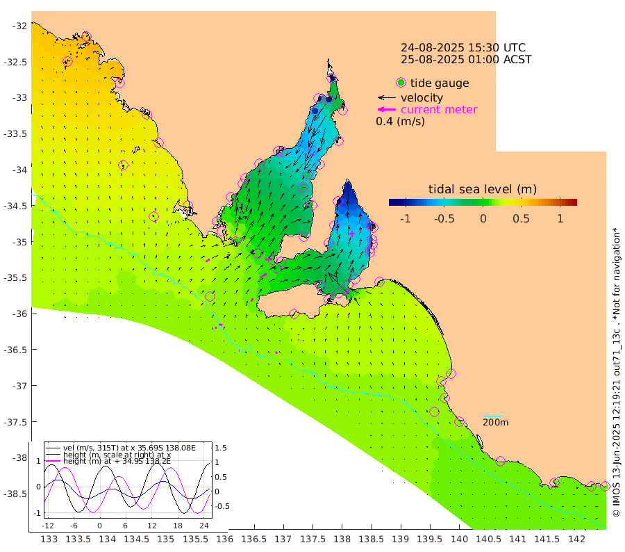 1cm/s 78T +10cm/s rms + 5cm/s 114T. SAM1DS 520m 10cm/s 62T +13cm/s rms + 5cm/s -36T. SAM2CP 100m 7cm/s 108T +21cm/s rms + 18cm/s 142T. SAM3MS 168m 5cm/s 149T +22cm/s rms + 0cm/s -30T. SAM4CY 117m 4cm/s -5T +23cm/s rms + 2cm/s 99T. SAM5CB 94m 16cm/s 59T +8cm/s rms + 3cm/s -172T. SAM6IS 83m 3cm/s 107T +11cm/s rms + 7cm/s 150T. SAM7DS 519m 14cm/s 83T +10cm/s rms + 2cm/s 87T. SAM8SG 47m 7cm/s 32T +20cm/s rms + 12cm/s -168T. NRSKAI 101m 13cm Warrnambool 14cm Port Fairy 15cm Portland 16cm Port Macdonnell 15cm Beachport 16cm Cape Rabelais (off) 18cm Robe 19cm Cape Jaffa 18cm Kingston 14cm Victor Harbor 20cm Vivonne Bay -37cm Kingscote -36cm American River -21cm Penneshaw -34cm Cape Jervis -55cm Second Valley -68cm Port Noarlunga -72cm Port Stanvac -75cm Brighton -76cm Glenelg -87cm Port Adelaide (Outer Harbor) -105cm Angus Inlet (Garden Island) -103cm Ardrossan -67cm Port Vincent -61cm Port Giles 7cm Stenhouse Bay 3cm Althorpe Island 8cm Pondalowie Bay -10cm Point Turton -12cm Port Victoria -22cm Cape Elizabeth -30cm Tiparra Reef Light -48cm Wallaroo -60cm Middle Bank -21cm Port Broughton -92cm Port Pirie -117cm Red Cliff Point (Beacon 5) -99cm Port Bonython -101cm Whyalla -91cm Western Shoal Beacon -49cm Franklin Harbor -35cm Franklin Harbor Entrance Beacon -19cm Arno Bay -13cm Port Neill -7cm Cape Hardy 1cm Tumby Bay 6cm Reevesby Island 14cm Port Lincoln 19cm Taylors Landing -2cm Whalers Bay 10cm Wedge Island Mooring 17cm Shelf Edge Mooring 29cm Coffin Bay Entrance Beacon 26cm Greenly Island 33cm Elliston 35cm Pearson Island 25cm Venus Bay 54cm Blanche Port (Streaky Bay) 54cm Thevenard 52cm St Francis Island