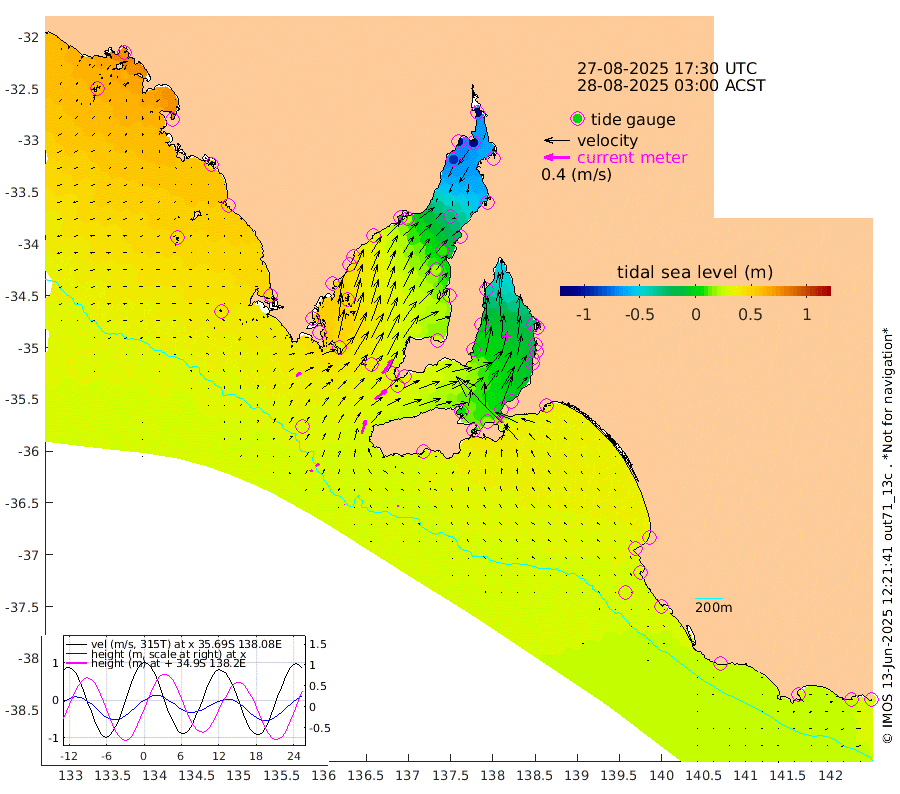 1cm/s 73T +10cm/s rms + 5cm/s 114T. SAM1DS 520m 9cm/s 50T +13cm/s rms + 5cm/s -36T. SAM2CP 100m 6cm/s 51T +21cm/s rms + 18cm/s 142T. SAM3MS 168m 2cm/s 101T +22cm/s rms + 0cm/s -30T. SAM4CY 117m 3cm/s -49T +23cm/s rms + 2cm/s 99T. SAM5CB 94m 23cm/s 53T +8cm/s rms + 3cm/s -172T. SAM6IS 83m 4cm/s 60T +11cm/s rms + 7cm/s 150T. SAM7DS 519m 26cm/s 38T +10cm/s rms + 2cm/s 87T. SAM8SG 47m 22cm/s 17T +20cm/s rms + 12cm/s -168T. NRSKAI 101m 28cm Warrnambool 28cm Port Fairy 28cm Portland 31cm Port Macdonnell 29cm Beachport 30cm Cape Rabelais (off) 31cm Robe 32cm Cape Jaffa 34cm Kingston 32cm Victor Harbor 32cm Vivonne Bay 1cm Kingscote -3cm American River 17cm Penneshaw -2cm Cape Jervis -17cm Second Valley -19cm Port Noarlunga -20cm Port Stanvac -25cm Brighton -22cm Glenelg -30cm Port Adelaide (Outer Harbor) -63cm Angus Inlet (Garden Island) -34cm Ardrossan -2cm Port Vincent -1cm Port Giles 35cm Stenhouse Bay 29cm Althorpe Island 30cm Pondalowie Bay 30cm Point Turton 28cm Port Victoria 19cm Cape Elizabeth 8cm Tiparra Reef Light -23cm Wallaroo -30cm Middle Bank -47cm Port Broughton -118cm Port Pirie -142cm Red Cliff Point (Beacon 5) -107cm Port Bonython -105cm Whyalla -91cm Western Shoal Beacon -11cm Franklin Harbor 21cm Franklin Harbor Entrance Beacon 35cm Arno Bay 48cm Port Neill 42cm Cape Hardy 47cm Tumby Bay 47cm Reevesby Island 55cm Port Lincoln 49cm Taylors Landing 32cm Whalers Bay 38cm Wedge Island Mooring 31cm Shelf Edge Mooring 47cm Coffin Bay Entrance Beacon 39cm Greenly Island 47cm Elliston 45cm Pearson Island 39cm Venus Bay 73cm Blanche Port (Streaky Bay) 72cm Thevenard 58cm St Francis Island