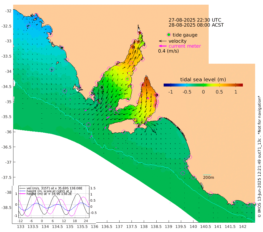 1cm/s 167T +10cm/s rms + 5cm/s 114T. SAM1DS 520m 10cm/s -116T +13cm/s rms + 5cm/s -36T. SAM2CP 100m 7cm/s -81T +21cm/s rms + 18cm/s 142T. SAM3MS 168m 3cm/s -7T +22cm/s rms + 0cm/s -30T. SAM4CY 117m 4cm/s -175T +23cm/s rms + 2cm/s 99T. SAM5CB 94m 17cm/s -118T +8cm/s rms + 3cm/s -172T. SAM6IS 83m 3cm/s -72T +11cm/s rms + 7cm/s 150T. SAM7DS 519m 15cm/s -108T +10cm/s rms + 2cm/s 87T. SAM8SG 47m 11cm/s -158T +20cm/s rms + 12cm/s -168T. NRSKAI 101m -22cm Warrnambool -21cm Port Fairy -21cm Portland -22cm Port Macdonnell -20cm Beachport -23cm Cape Rabelais (off) -22cm Robe -23cm Cape Jaffa -26cm Kingston -19cm Victor Harbor -23cm Vivonne Bay 41cm Kingscote 40cm American River 23cm Penneshaw 38cm Cape Jervis 61cm Second Valley 76cm Port Noarlunga 80cm Port Stanvac 83cm Brighton 83cm Glenelg 97cm Port Adelaide (Outer Harbor) 115cm Angus Inlet (Garden Island) 115cm Ardrossan 79cm Port Vincent 67cm Port Giles -9cm Stenhouse Bay -6cm Althorpe Island -11cm Pondalowie Bay 6cm Point Turton 9cm Port Victoria 19cm Cape Elizabeth 28cm Tiparra Reef Light 50cm Wallaroo 61cm Middle Bank 20cm Port Broughton 102cm Port Pirie 120cm Red Cliff Point (Beacon 5) 100cm Port Bonython 108cm Whyalla 101cm Western Shoal Beacon 52cm Franklin Harbor 32cm Franklin Harbor Entrance Beacon 14cm Arno Bay 0cm Port Neill 0cm Cape Hardy -8cm Tumby Bay -5cm Reevesby Island -18cm Port Lincoln -23cm Taylors Landing 1cm Whalers Bay -14cm Wedge Island Mooring -20cm Shelf Edge Mooring -33cm Coffin Bay Entrance Beacon -27cm Greenly Island -35cm Elliston -39cm Pearson Island -26cm Venus Bay -57cm Blanche Port (Streaky Bay) -57cm Thevenard -52cm St Francis Island