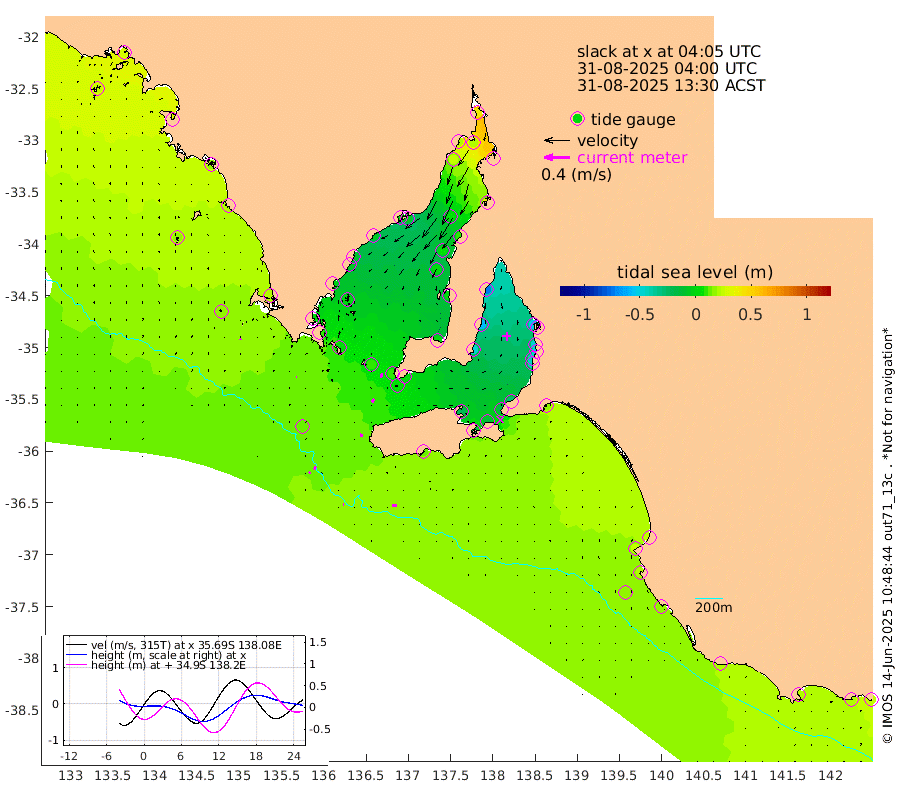 1cm/s -87T +10cm/s rms + 5cm/s 114T. SAM1DS 520m 1cm/s 118T +13cm/s rms + 5cm/s -36T. SAM2CP 100m 5cm/s -164T +21cm/s rms + 18cm/s 142T. SAM3MS 168m 7cm/s -85T +22cm/s rms + 0cm/s -30T. SAM4CY 117m 2cm/s 35T +23cm/s rms + 2cm/s 99T. SAM5CB 94m 6cm/s -134T +8cm/s rms + 3cm/s -172T. SAM6IS 83m 3cm/s -162T +11cm/s rms + 7cm/s 150T. SAM7DS 519m 6cm/s -161T +10cm/s rms + 2cm/s 87T. SAM8SG 47m 4cm/s -168T +20cm/s rms + 12cm/s -168T. NRSKAI 101m 24cm Warrnambool 22cm Port Fairy 22cm Portland 21cm Port Macdonnell 17cm Beachport 18cm Cape Rabelais (off) 20cm Robe 24cm Cape Jaffa 23cm Kingston 16cm Victor Harbor 14cm Vivonne Bay -22cm Kingscote -16cm American River -14cm Penneshaw -15cm Cape Jervis -27cm Second Valley -42cm Port Noarlunga -44cm Port Stanvac -47cm Brighton -47cm Glenelg -54cm Port Adelaide (Outer Harbor) -49cm Angus Inlet (Garden Island) -72cm Ardrossan -59cm Port Vincent -46cm Port Giles 2cm Stenhouse Bay 7cm Althorpe Island 8cm Pondalowie Bay 3cm Point Turton 2cm Port Victoria 0cm Cape Elizabeth 5cm Tiparra Reef Light 10cm Wallaroo 6cm Middle Bank 41cm Port Broughton 41cm Port Pirie 39cm Red Cliff Point (Beacon 5) 19cm Port Bonython 22cm Whyalla 23cm Western Shoal Beacon 3cm Franklin Harbor -6cm Franklin Harbor Entrance Beacon -7cm Arno Bay -10cm Port Neill -4cm Cape Hardy -2cm Tumby Bay 2cm Reevesby Island 4cm Port Lincoln 8cm Taylors Landing 3cm Whalers Bay 9cm Wedge Island Mooring 15cm Shelf Edge Mooring 21cm Coffin Bay Entrance Beacon 16cm Greenly Island 22cm Elliston 16cm Pearson Island 18cm Venus Bay 29cm Blanche Port (Streaky Bay) 29cm Thevenard 24cm St Francis Island