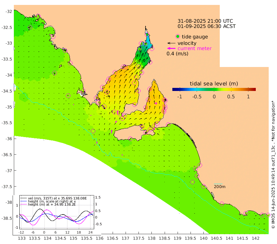 0cm/s 91T +10cm/s rms + 5cm/s 114T. SAM1DS 520m 3cm/s -63T +13cm/s rms + 5cm/s -36T. SAM2CP 100m 8cm/s -14T +21cm/s rms + 18cm/s 142T. SAM3MS 168m 5cm/s -2T +22cm/s rms + 0cm/s -30T. SAM4CY 117m 2cm/s -118T +23cm/s rms + 2cm/s 99T. SAM5CB 94m 10cm/s 41T +8cm/s rms + 3cm/s -172T. SAM6IS 83m 4cm/s -2T +11cm/s rms + 7cm/s 150T. SAM7DS 519m 21cm/s 4T +10cm/s rms + 2cm/s 87T. SAM8SG 47m 16cm/s 9T +20cm/s rms + 12cm/s -168T. NRSKAI 101m 15cm Warrnambool 14cm Port Fairy 16cm Portland 16cm Port Macdonnell 17cm Beachport 17cm Cape Rabelais (off) 16cm Robe 15cm Cape Jaffa 17cm Kingston 22cm Victor Harbor 17cm Vivonne Bay 46cm Kingscote 41cm American River 44cm Penneshaw 40cm Cape Jervis 47cm Second Valley 58cm Port Noarlunga 61cm Port Stanvac 61cm Brighton 65cm Glenelg 68cm Port Adelaide (Outer Harbor) 56cm Angus Inlet (Garden Island) 81cm Ardrossan 76cm Port Vincent 68cm Port Giles 32cm Stenhouse Bay 31cm Althorpe Island 25cm Pondalowie Bay 39cm Point Turton 37cm Port Victoria 40cm Cape Elizabeth 41cm Tiparra Reef Light 31cm Wallaroo 36cm Middle Bank -21cm Port Broughton -8cm Port Pirie -7cm Red Cliff Point (Beacon 5) 12cm Port Bonython 12cm Whyalla 15cm Western Shoal Beacon 37cm Franklin Harbor 55cm Franklin Harbor Entrance Beacon 54cm Arno Bay 62cm Port Neill 50cm Cape Hardy 47cm Tumby Bay 43cm Reevesby Island 41cm Port Lincoln 32cm Taylors Landing 35cm Whalers Bay 30cm Wedge Island Mooring 19cm Shelf Edge Mooring 20cm Coffin Bay Entrance Beacon 16cm Greenly Island 16cm Elliston 15cm Pearson Island 15cm Venus Bay 18cm Blanche Port (Streaky Bay) 16cm Thevenard 11cm St Francis Island