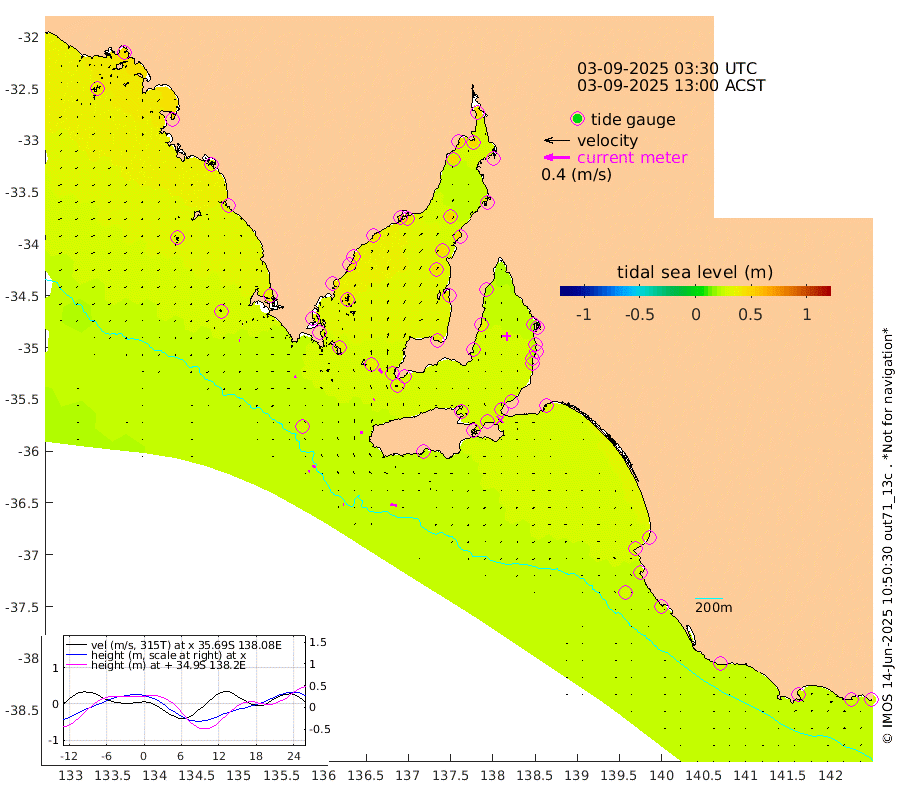 1cm/s -91T +10cm/s rms + 5cm/s 114T. SAM1DS 520m 3cm/s -117T +13cm/s rms + 5cm/s -36T. SAM2CP 100m 4cm/s -99T +21cm/s rms + 18cm/s 142T. SAM3MS 168m 10cm/s -76T +22cm/s rms + 0cm/s -30T. SAM4CY 117m 1cm/s -109T +23cm/s rms + 2cm/s 99T. SAM5CB 94m 1cm/s -116T +8cm/s rms + 3cm/s -172T. SAM6IS 83m 2cm/s -110T +11cm/s rms + 7cm/s 150T. SAM7DS 519m 9cm/s -33T +10cm/s rms + 2cm/s 87T. SAM8SG 47m 4cm/s -1T +20cm/s rms + 12cm/s -168T. NRSKAI 101m 29cm Warrnambool 29cm Port Fairy 29cm Portland 30cm Port Macdonnell 26cm Beachport 29cm Cape Rabelais (off) 29cm Robe 33cm Cape Jaffa 32cm Kingston 31cm Victor Harbor 23cm Vivonne Bay 28cm Kingscote 29cm American River 28cm Penneshaw 26cm Cape Jervis 23cm Second Valley 24cm Port Noarlunga 24cm Port Stanvac 21cm Brighton 23cm Glenelg 22cm Port Adelaide (Outer Harbor) 17cm Angus Inlet (Garden Island) 21cm Ardrossan 35cm Port Vincent 24cm Port Giles 28cm Stenhouse Bay 32cm Althorpe Island 30cm Pondalowie Bay 40cm Point Turton 40cm Port Victoria 43cm Cape Elizabeth 44cm Tiparra Reef Light 46cm Wallaroo 46cm Middle Bank 38cm Port Broughton 47cm Port Pirie 44cm Red Cliff Point (Beacon 5) 45cm Port Bonython 45cm Whyalla 46cm Western Shoal Beacon 43cm Franklin Harbor 44cm Franklin Harbor Entrance Beacon 42cm Arno Bay 44cm Port Neill 43cm Cape Hardy 41cm Tumby Bay 43cm Reevesby Island 37cm Port Lincoln 33cm Taylors Landing 36cm Whalers Bay 34cm Wedge Island Mooring 27cm Shelf Edge Mooring 36cm Coffin Bay Entrance Beacon 28cm Greenly Island 33cm Elliston 32cm Pearson Island 33cm Venus Bay 48cm Blanche Port (Streaky Bay) 44cm Thevenard 39cm St Francis Island
