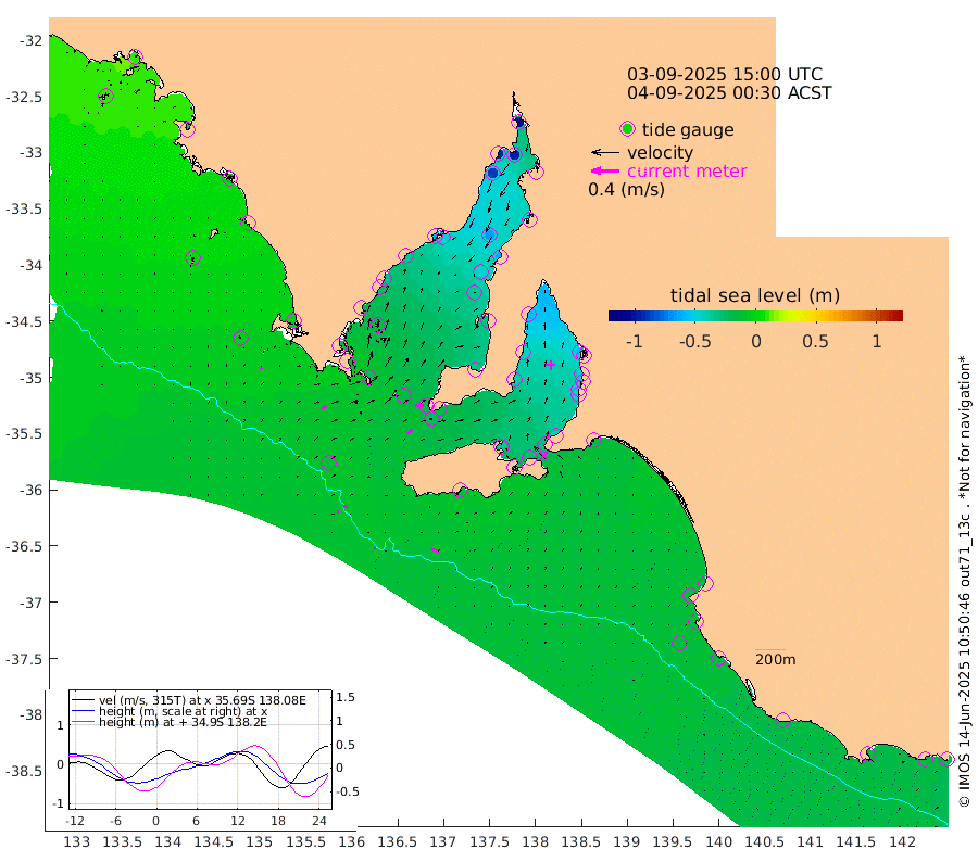 1cm/s 99T +10cm/s rms + 5cm/s 114T. SAM1DS 520m 7cm/s 65T +13cm/s rms + 5cm/s -36T. SAM2CP 100m 6cm/s 89T +21cm/s rms + 18cm/s 142T. SAM3MS 168m 10cm/s 109T +22cm/s rms + 0cm/s -30T. SAM4CY 117m 2cm/s 20T +23cm/s rms + 2cm/s 99T. SAM5CB 94m 9cm/s 59T +8cm/s rms + 3cm/s -172T. SAM6IS 83m 3cm/s 91T +11cm/s rms + 7cm/s 150T. SAM7DS 519m 11cm/s 91T +10cm/s rms + 2cm/s 87T. SAM8SG 47m 2cm/s 71T +20cm/s rms + 12cm/s -168T. NRSKAI 101m -22cm Warrnambool -18cm Port Fairy -19cm Portland -18cm Port Macdonnell -16cm Beachport -16cm Cape Rabelais (off) -16cm Robe -16cm Cape Jaffa -16cm Kingston -16cm Victor Harbor -8cm Vivonne Bay -36cm Kingscote -36cm American River -29cm Penneshaw -33cm Cape Jervis -43cm Second Valley -46cm Port Noarlunga -49cm Port Stanvac -49cm Brighton -51cm Glenelg -54cm Port Adelaide (Outer Harbor) -66cm Angus Inlet (Garden Island) -59cm Ardrossan -42cm Port Vincent -44cm Port Giles -18cm Stenhouse Bay -23cm Althorpe Island -18cm Pondalowie Bay -33cm Point Turton -31cm Port Victoria -37cm Cape Elizabeth -48cm Tiparra Reef Light -60cm Wallaroo -66cm Middle Bank -49cm Port Broughton -95cm Port Pirie -102cm Red Cliff Point (Beacon 5) -97cm Port Bonython -96cm Whyalla -87cm Western Shoal Beacon -54cm Franklin Harbor -45cm Franklin Harbor Entrance Beacon -35cm Arno Bay -34cm Port Neill -26cm Cape Hardy -21cm Tumby Bay -19cm Reevesby Island -15cm Port Lincoln -12cm Taylors Landing -24cm Whalers Bay -18cm Wedge Island Mooring -12cm Shelf Edge Mooring -7cm Coffin Bay Entrance Beacon -4cm Greenly Island -3cm Elliston 0cm Pearson Island -7cm Venus Bay 6cm Blanche Port (Streaky Bay) 9cm Thevenard 10cm St Francis Island