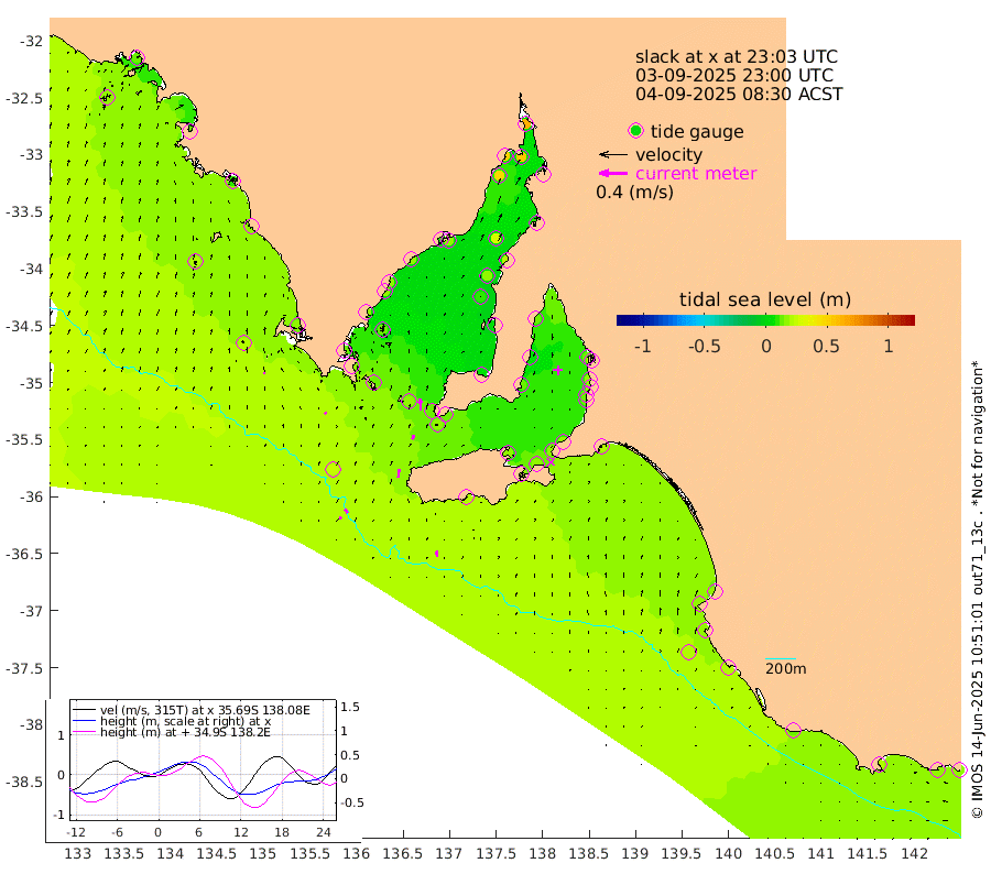 0cm/s 34T +10cm/s rms + 5cm/s 114T. SAM1DS 520m 2cm/s -28T +13cm/s rms + 5cm/s -36T. SAM2CP 100m 6cm/s -27T +21cm/s rms + 18cm/s 142T. SAM3MS 168m 8cm/s -8T +22cm/s rms + 0cm/s -30T. SAM4CY 117m 3cm/s -9T +23cm/s rms + 2cm/s 99T. SAM5CB 94m 6cm/s 19T +8cm/s rms + 3cm/s -172T. SAM6IS 83m 3cm/s -32T +11cm/s rms + 7cm/s 150T. SAM7DS 519m 17cm/s -4T +10cm/s rms + 2cm/s 87T. SAM8SG 47m 11cm/s 5T +20cm/s rms + 12cm/s -168T. NRSKAI 101m 18cm Warrnambool 17cm Port Fairy 20cm Portland 15cm Port Macdonnell 21cm Beachport 21cm Cape Rabelais (off) 18cm Robe 18cm Cape Jaffa 17cm Kingston 22cm Victor Harbor 22cm Vivonne Bay 16cm Kingscote 18cm American River 18cm Penneshaw 18cm Cape Jervis 19cm Second Valley 13cm Port Noarlunga 14cm Port Stanvac 16cm Brighton 15cm Glenelg 14cm Port Adelaide (Outer Harbor) 23cm Angus Inlet (Garden Island) 12cm Ardrossan 7cm Port Vincent 11cm Port Giles 14cm Stenhouse Bay 18cm Althorpe Island 12cm Pondalowie Bay 7cm Point Turton 7cm Port Victoria 9cm Cape Elizabeth 17cm Tiparra Reef Light 22cm Wallaroo 27cm Middle Bank 8cm Port Broughton 54cm Port Pirie 63cm Red Cliff Point (Beacon 5) 55cm Port Bonython 51cm Whyalla 45cm Western Shoal Beacon 10cm Franklin Harbor 16cm Franklin Harbor Entrance Beacon 15cm Arno Bay 17cm Port Neill 16cm Cape Hardy 16cm Tumby Bay 13cm Reevesby Island 15cm Port Lincoln 18cm Taylors Landing 12cm Whalers Bay 17cm Wedge Island Mooring 23cm Shelf Edge Mooring 17cm Coffin Bay Entrance Beacon 19cm Greenly Island 18cm Elliston 20cm Pearson Island 10cm Venus Bay 11cm Blanche Port (Streaky Bay) 12cm Thevenard 18cm St Francis Island