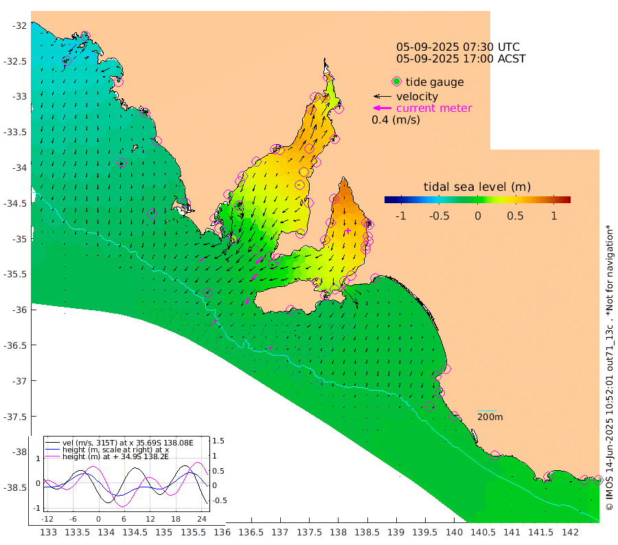 1cm/s -85T +10cm/s rms + 5cm/s 114T. SAM1DS 520m 10cm/s -131T +13cm/s rms + 5cm/s -36T. SAM2CP 100m 7cm/s -131T +21cm/s rms + 18cm/s 142T. SAM3MS 168m 10cm/s -111T +22cm/s rms + 0cm/s -30T. SAM4CY 117m 6cm/s -176T +23cm/s rms + 2cm/s 99T. SAM5CB 94m 17cm/s -134T +8cm/s rms + 3cm/s -172T. SAM6IS 83m 3cm/s -143T +11cm/s rms + 7cm/s 150T. SAM7DS 519m 21cm/s -139T +10cm/s rms + 2cm/s 87T. SAM8SG 47m 14cm/s -164T +20cm/s rms + 12cm/s -168T. NRSKAI 101m -1cm Warrnambool -3cm Port Fairy -6cm Portland -2cm Port Macdonnell -10cm Beachport -10cm Cape Rabelais (off) -8cm Robe -8cm Cape Jaffa -9cm Kingston -10cm Victor Harbor -20cm Vivonne Bay 36cm Kingscote 33cm American River 21cm Penneshaw 29cm Cape Jervis 45cm Second Valley 60cm Port Noarlunga 63cm Port Stanvac 63cm Brighton 65cm Glenelg 74cm Port Adelaide (Outer Harbor) 83cm Angus Inlet (Garden Island) 88cm Ardrossan 63cm Port Vincent 58cm Port Giles 3cm Stenhouse Bay 4cm Althorpe Island 3cm Pondalowie Bay 30cm Point Turton 29cm Port Victoria 34cm Cape Elizabeth 40cm Tiparra Reef Light 52cm Wallaroo 57cm Middle Bank 44cm Port Broughton 67cm Port Pirie 69cm Red Cliff Point (Beacon 5) 73cm Port Bonython 75cm Whyalla 68cm Western Shoal Beacon 57cm Franklin Harbor 39cm Franklin Harbor Entrance Beacon 26cm Arno Bay 22cm Port Neill 14cm Cape Hardy 6cm Tumby Bay 6cm Reevesby Island -3cm Port Lincoln -12cm Taylors Landing 14cm Whalers Bay -2cm Wedge Island Mooring -16cm Shelf Edge Mooring -21cm Coffin Bay Entrance Beacon -23cm Greenly Island -27cm Elliston -29cm Pearson Island -12cm Venus Bay -36cm Blanche Port (Streaky Bay) -39cm Thevenard -39cm St Francis Island