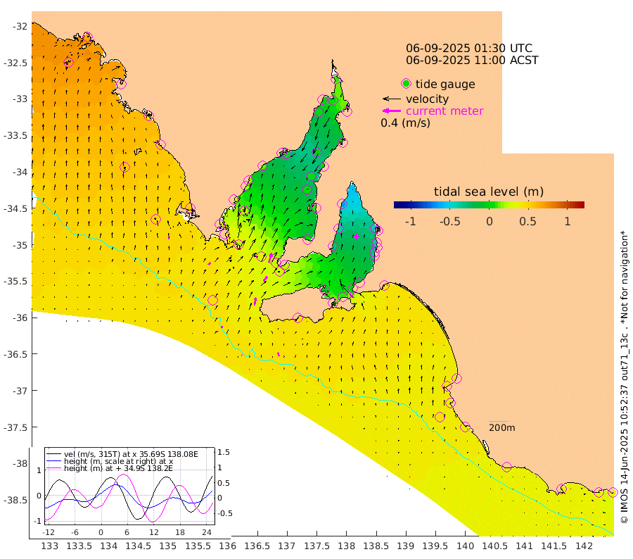 1cm/s -59T +10cm/s rms + 5cm/s 114T. SAM1DS 520m 6cm/s 41T +13cm/s rms + 5cm/s -36T. SAM2CP 100m 4cm/s 0T +21cm/s rms + 18cm/s 142T. SAM3MS 168m 8cm/s -25T +22cm/s rms + 0cm/s -30T. SAM4CY 117m 6cm/s -4T +23cm/s rms + 2cm/s 99T. SAM5CB 94m 13cm/s 41T +8cm/s rms + 3cm/s -172T. SAM6IS 83m 2cm/s -28T +11cm/s rms + 7cm/s 150T. SAM7DS 519m 22cm/s 16T +10cm/s rms + 2cm/s 87T. SAM8SG 47m 17cm/s 11T +20cm/s rms + 12cm/s -168T. NRSKAI 101m 34cm Warrnambool 34cm Port Fairy 37cm Portland 34cm Port Macdonnell 39cm Beachport 41cm Cape Rabelais (off) 39cm Robe 42cm Cape Jaffa 40cm Kingston 41cm Victor Harbor 43cm Vivonne Bay -6cm Kingscote -2cm American River 8cm Penneshaw -1cm Cape Jervis -16cm Second Valley -34cm Port Noarlunga -37cm Port Stanvac -36cm Brighton -38cm Glenelg -49cm Port Adelaide (Outer Harbor) -52cm Angus Inlet (Garden Island) -64cm Ardrossan -40cm Port Vincent -32cm Port Giles 23cm Stenhouse Bay 29cm Althorpe Island 25cm Pondalowie Bay 7cm Point Turton 8cm Port Victoria 5cm Cape Elizabeth 5cm Tiparra Reef Light 2cm Wallaroo 0cm Middle Bank 11cm Port Broughton 12cm Port Pirie 10cm Red Cliff Point (Beacon 5) 2cm Port Bonython 0cm Whyalla 1cm Western Shoal Beacon -13cm Franklin Harbor 3cm Franklin Harbor Entrance Beacon 12cm Arno Bay 17cm Port Neill 22cm Cape Hardy 28cm Tumby Bay 25cm Reevesby Island 33cm Port Lincoln 39cm Taylors Landing 19cm Whalers Bay 33cm Wedge Island Mooring 43cm Shelf Edge Mooring 49cm Coffin Bay Entrance Beacon 46cm Greenly Island 54cm Elliston 55cm Pearson Island 37cm Venus Bay 66cm Blanche Port (Streaky Bay) 66cm Thevenard 65cm St Francis Island