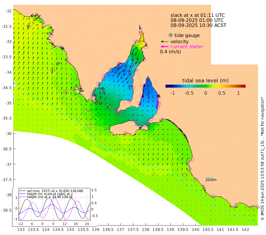 1cm/s -70T +10cm/s rms + 5cm/s 114T. SAM1DS 520m 6cm/s 54T +13cm/s rms + 5cm/s -36T. SAM2CP 100m 0cm/s 16T +21cm/s rms + 18cm/s 142T. SAM3MS 168m 7cm/s 11T +22cm/s rms + 0cm/s -30T. SAM4CY 117m 7cm/s 17T +23cm/s rms + 2cm/s 99T. SAM5CB 94m 3cm/s 25T +8cm/s rms + 3cm/s -172T. SAM6IS 83m 1cm/s -76T +11cm/s rms + 7cm/s 150T. SAM7DS 519m 6cm/s 42T +10cm/s rms + 2cm/s 87T. SAM8SG 47m 4cm/s 7T +20cm/s rms + 12cm/s -168T. NRSKAI 101m 16cm Warrnambool 16cm Port Fairy 17cm Portland 10cm Port Macdonnell 17cm Beachport 17cm Cape Rabelais (off) 15cm Robe 16cm Cape Jaffa 15cm Kingston 13cm Victor Harbor 20cm Vivonne Bay -46cm Kingscote -37cm American River -32cm Penneshaw -34cm Cape Jervis -49cm Second Valley -76cm Port Noarlunga -80cm Port Stanvac -79cm Brighton -84cm Glenelg -93cm Port Adelaide (Outer Harbor) -77cm Angus Inlet (Garden Island) -118cm Ardrossan -104cm Port Vincent -84cm Port Giles -15cm Stenhouse Bay -9cm Althorpe Island -9cm Pondalowie Bay -37cm Point Turton -37cm Port Victoria -37cm Cape Elizabeth -33cm Tiparra Reef Light -23cm Wallaroo -25cm Middle Bank 14cm Port Broughton 43cm Port Pirie 52cm Red Cliff Point (Beacon 5) 19cm Port Bonython 15cm Whyalla 9cm Western Shoal Beacon -41cm Franklin Harbor -46cm Franklin Harbor Entrance Beacon -43cm Arno Bay -47cm Port Neill -35cm Cape Hardy -28cm Tumby Bay -27cm Reevesby Island -19cm Port Lincoln -3cm Taylors Landing -25cm Whalers Bay -6cm Wedge Island Mooring 17cm Shelf Edge Mooring 13cm Coffin Bay Entrance Beacon 18cm Greenly Island 18cm Elliston 18cm Pearson Island 4cm Venus Bay 13cm Blanche Port (Streaky Bay) 16cm Thevenard 21cm St Francis Island