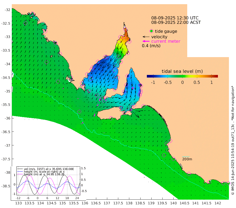 0cm/s 40T +10cm/s rms + 5cm/s 114T. SAM1DS 520m 3cm/s 85T +13cm/s rms + 5cm/s -36T. SAM2CP 100m 7cm/s -177T +21cm/s rms + 18cm/s 142T. SAM3MS 168m 2cm/s -166T +22cm/s rms + 0cm/s -30T. SAM4CY 117m 6cm/s 23T +23cm/s rms + 2cm/s 99T. SAM5CB 94m 9cm/s -134T +8cm/s rms + 3cm/s -172T. SAM6IS 83m 3cm/s -157T +11cm/s rms + 7cm/s 150T. SAM7DS 519m 19cm/s -167T +10cm/s rms + 2cm/s 87T. SAM8SG 47m 15cm/s -169T +20cm/s rms + 12cm/s -168T. NRSKAI 101m 3cm Warrnambool 2cm Port Fairy 2cm Portland -4cm Port Macdonnell 0cm Beachport 0cm Cape Rabelais (off) -2cm Robe -6cm Cape Jaffa -5cm Kingston -11cm Victor Harbor -1cm Vivonne Bay -50cm Kingscote -42cm American River -48cm Penneshaw -42cm Cape Jervis -51cm Second Valley -69cm Port Noarlunga -74cm Port Stanvac -73cm Brighton -79cm Glenelg -83cm Port Adelaide (Outer Harbor) -48cm Angus Inlet (Garden Island) -104cm Ardrossan -102cm Port Vincent -87cm Port Giles -32cm Stenhouse Bay -29cm Althorpe Island -22cm Pondalowie Bay -46cm Point Turton -49cm Port Victoria -51cm Cape Elizabeth -39cm Tiparra Reef Light -17cm Wallaroo -20cm Middle Bank 42cm Port Broughton 82cm Port Pirie 79cm Red Cliff Point (Beacon 5) 64cm Port Bonython 48cm Whyalla 30cm Western Shoal Beacon -41cm Franklin Harbor -68cm Franklin Harbor Entrance Beacon -67cm Arno Bay -73cm Port Neill -65cm Cape Hardy -62cm Tumby Bay -52cm Reevesby Island -50cm Port Lincoln -32cm Taylors Landing -44cm Whalers Bay -28cm Wedge Island Mooring -4cm Shelf Edge Mooring -15cm Coffin Bay Entrance Beacon -6cm Greenly Island -15cm Elliston -4cm Pearson Island -17cm Venus Bay -27cm Blanche Port (Streaky Bay) -24cm Thevenard -9cm St Francis Island