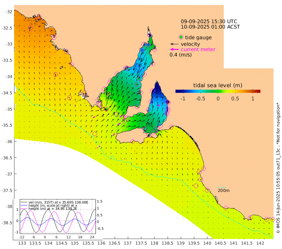 0cm/s 23T +10cm/s rms + 5cm/s 114T. SAM1DS 520m 11cm/s 55T +13cm/s rms + 5cm/s -36T. SAM2CP 100m 6cm/s 99T +21cm/s rms + 18cm/s 142T. SAM3MS 168m 2cm/s 132T +22cm/s rms + 0cm/s -30T. SAM4CY 117m 6cm/s -8T +23cm/s rms + 2cm/s 99T. SAM5CB 94m 18cm/s 55T +8cm/s rms + 3cm/s -172T. SAM6IS 83m 3cm/s 97T +11cm/s rms + 7cm/s 150T. SAM7DS 519m 18cm/s 56T +10cm/s rms + 2cm/s 87T. SAM8SG 47m 14cm/s 21T +20cm/s rms + 12cm/s -168T. NRSKAI 101m 31cm Warrnambool 30cm Port Fairy 31cm Portland 31cm Port Macdonnell 32cm Beachport 34cm Cape Rabelais (off) 34cm Robe 34cm Cape Jaffa 36cm Kingston 31cm Victor Harbor 37cm Vivonne Bay -36cm Kingscote -33cm American River -16cm Penneshaw -31cm Cape Jervis -57cm Second Valley -73cm Port Noarlunga -78cm Port Stanvac -83cm Brighton -83cm Glenelg -97cm Port Adelaide (Outer Harbor) -111cm Angus Inlet (Garden Island) -117cm Ardrossan -77cm Port Vincent -66cm Port Giles 18cm Stenhouse Bay 16cm Althorpe Island 21cm Pondalowie Bay 0cm Point Turton -4cm Port Victoria -15cm Cape Elizabeth -17cm Tiparra Reef Light -37cm Wallaroo -49cm Middle Bank -13cm Port Broughton -75cm Port Pirie -102cm Red Cliff Point (Beacon 5) -78cm Port Bonython -86cm Whyalla -78cm Western Shoal Beacon -47cm Franklin Harbor -27cm Franklin Harbor Entrance Beacon -7cm Arno Bay 3cm Port Neill 7cm Cape Hardy 15cm Tumby Bay 20cm Reevesby Island 29cm Port Lincoln 35cm Taylors Landing 8cm Whalers Bay 25cm Wedge Island Mooring 34cm Shelf Edge Mooring 48cm Coffin Bay Entrance Beacon 42cm Greenly Island 50cm Elliston 54cm Pearson Island 38cm Venus Bay 75cm Blanche Port (Streaky Bay) 75cm Thevenard 67cm St Francis Island