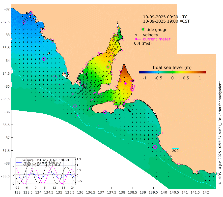 1cm/s 107T +10cm/s rms + 5cm/s 114T. SAM1DS 520m 9cm/s -124T +13cm/s rms + 5cm/s -36T. SAM2CP 100m 5cm/s -84T +21cm/s rms + 18cm/s 142T. SAM3MS 168m 2cm/s -153T +22cm/s rms + 0cm/s -30T. SAM4CY 117m 5cm/s 180T +23cm/s rms + 2cm/s 99T. SAM5CB 94m 14cm/s -125T +8cm/s rms + 3cm/s -172T. SAM6IS 83m 2cm/s -79T +11cm/s rms + 7cm/s 150T. SAM7DS 519m 14cm/s -124T +10cm/s rms + 2cm/s 87T. SAM8SG 47m 12cm/s -161T +20cm/s rms + 12cm/s -168T. NRSKAI 101m -33cm Warrnambool -31cm Port Fairy -32cm Portland -30cm Port Macdonnell -31cm Beachport -33cm Cape Rabelais (off) -34cm Robe -35cm Cape Jaffa -37cm Kingston -31cm Victor Harbor -34cm Vivonne Bay 40cm Kingscote 33cm American River 17cm Penneshaw 31cm Cape Jervis 56cm Second Valley 77cm Port Noarlunga 81cm Port Stanvac 86cm Brighton 86cm Glenelg 100cm Port Adelaide (Outer Harbor) 112cm Angus Inlet (Garden Island) 122cm Ardrossan 85cm Port Vincent 71cm Port Giles -13cm Stenhouse Bay -14cm Althorpe Island -16cm Pondalowie Bay 3cm Point Turton 8cm Port Victoria 14cm Cape Elizabeth 13cm Tiparra Reef Light 29cm Wallaroo 39cm Middle Bank 2cm Port Broughton 46cm Port Pirie 59cm Red Cliff Point (Beacon 5) 59cm Port Bonython 61cm Whyalla 53cm Western Shoal Beacon 38cm Franklin Harbor 24cm Franklin Harbor Entrance Beacon 10cm Arno Bay 1cm Port Neill -4cm Cape Hardy -11cm Tumby Bay -15cm Reevesby Island -23cm Port Lincoln -30cm Taylors Landing -5cm Whalers Bay -22cm Wedge Island Mooring -32cm Shelf Edge Mooring -45cm Coffin Bay Entrance Beacon -38cm Greenly Island -46cm Elliston -45cm Pearson Island -36cm Venus Bay -68cm Blanche Port (Streaky Bay) -68cm Thevenard -60cm St Francis Island