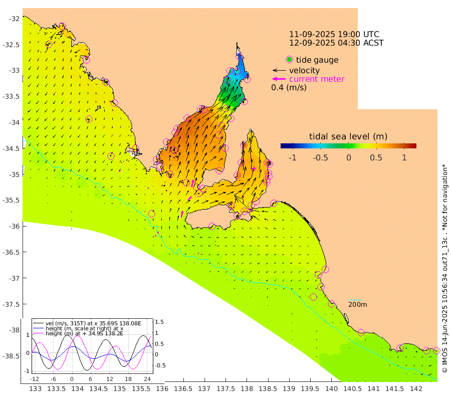 0cm/s 33T +10cm/s rms + 5cm/s 114T. SAM1DS 520m 3cm/s -40T +13cm/s rms + 5cm/s -36T. SAM2CP 100m 6cm/s 7T +21cm/s rms + 18cm/s 142T. SAM3MS 168m 2cm/s -70T +22cm/s rms + 0cm/s -30T. SAM4CY 117m 4cm/s -123T +23cm/s rms + 2cm/s 99T. SAM5CB 94m 15cm/s 48T +8cm/s rms + 3cm/s -172T. SAM6IS 83m 3cm/s 33T +11cm/s rms + 7cm/s 150T. SAM7DS 519m 23cm/s 15T +10cm/s rms + 2cm/s 87T. SAM8SG 47m 19cm/s 13T +20cm/s rms + 12cm/s -168T. NRSKAI 101m 20cm Warrnambool 19cm Port Fairy 21cm Portland 26cm Port Macdonnell 22cm Beachport 24cm Cape Rabelais (off) 25cm Robe 27cm Cape Jaffa 26cm Kingston 31cm Victor Harbor 23cm Vivonne Bay 58cm Kingscote 49cm American River 58cm Penneshaw 47cm Cape Jervis 52cm Second Valley 68cm Port Noarlunga 71cm Port Stanvac 69cm Brighton 75cm Glenelg 75cm Port Adelaide (Outer Harbor) 44cm Angus Inlet (Garden Island) 93cm Ardrossan 97cm Port Vincent 86cm Port Giles 51cm Stenhouse Bay 47cm Althorpe Island 42cm Pondalowie Bay 64cm Point Turton 62cm Port Victoria 59cm Cape Elizabeth 56cm Tiparra Reef Light 32cm Wallaroo 32cm Middle Bank -25cm Port Broughton -64cm Port Pirie -82cm Red Cliff Point (Beacon 5) -43cm Port Bonython -34cm Whyalla -20cm Western Shoal Beacon 44cm Franklin Harbor 74cm Franklin Harbor Entrance Beacon 80cm Arno Bay 90cm Port Neill 79cm Cape Hardy 76cm Tumby Bay 71cm Reevesby Island 70cm Port Lincoln 53cm Taylors Landing 59cm Whalers Bay 48cm Wedge Island Mooring 27cm Shelf Edge Mooring 38cm Coffin Bay Entrance Beacon 27cm Greenly Island 37cm Elliston 31cm Pearson Island 36cm Venus Bay 54cm Blanche Port (Streaky Bay) 50cm Thevenard 34cm St Francis Island